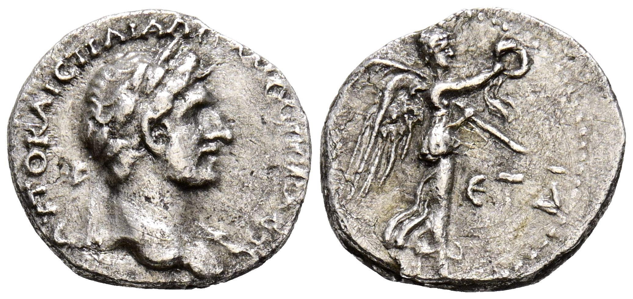HADRIAN. Hemidrachma. (Ar. 1.80g/14mm). 120-121 AD (Year 5). Cappadocia, Caesarea-Eusebia. (RPC 3076; SNG von Aulock 6414). Obv: Laureate and cuirassed bust of Hadrian facing right, around legend: ΑΥΤΟ ΚΑΙC ΤΡΑΙ ΑΔΡΙΑΝΟC CΕΒΑCΤ. Reverse: Flying Victory facing right with laurel wreath and palm, in front Greek legend: ЄTЄ. VF+. Nice specimen.