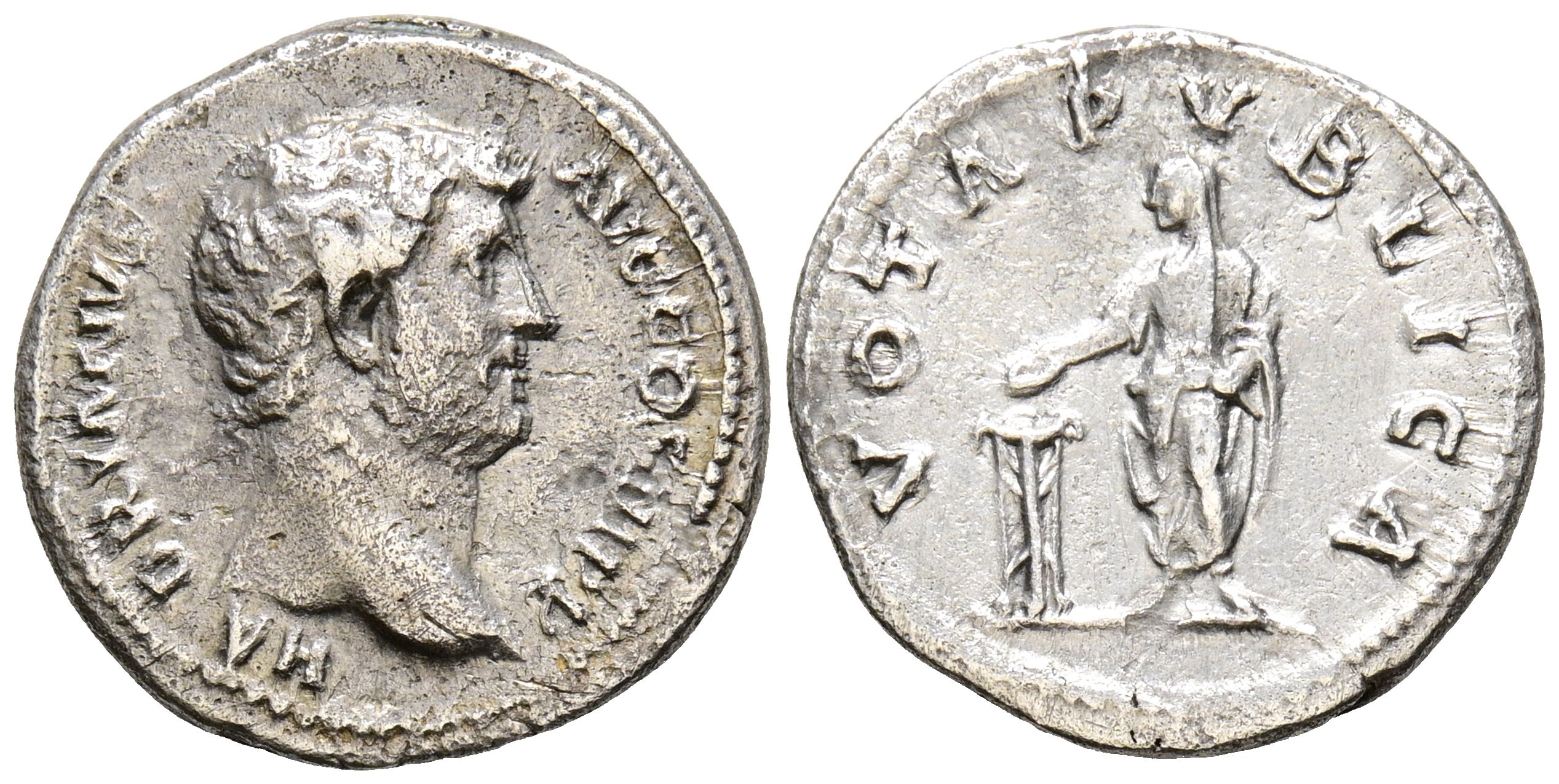 HADRIAN. Denarius. (Ar. 2.90g/18mm). 137 AD Rome. (RIC 290). Obv: Head of Hadrian to the right, around the legend: HADRIANVS AVG COS III P P. Rev: Veiled Hadrian standing to the left with a tripod patera, around the legend: VOTA PVBLICA. Very Fine.