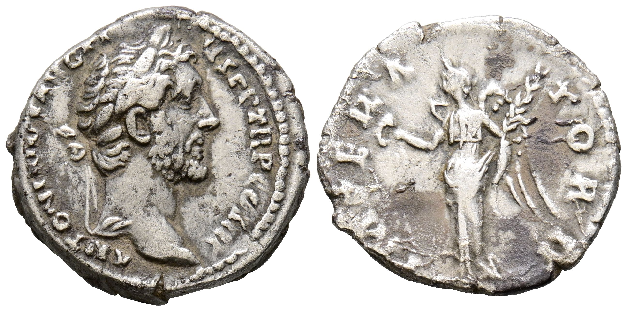 ANTONINUS PIO. Denarius. (Ar. 2.83g/19mm). 143-144 AD Rome. (RIC 111b). Obv: Laureate head of Antoninus Pius right, around legend: ANTONINVS AVG PIVS PP TR P COS III. Rev: Victory standing left wearing a laurel wreath and palm, around legend: IMPERATOR II. Very Fine-.