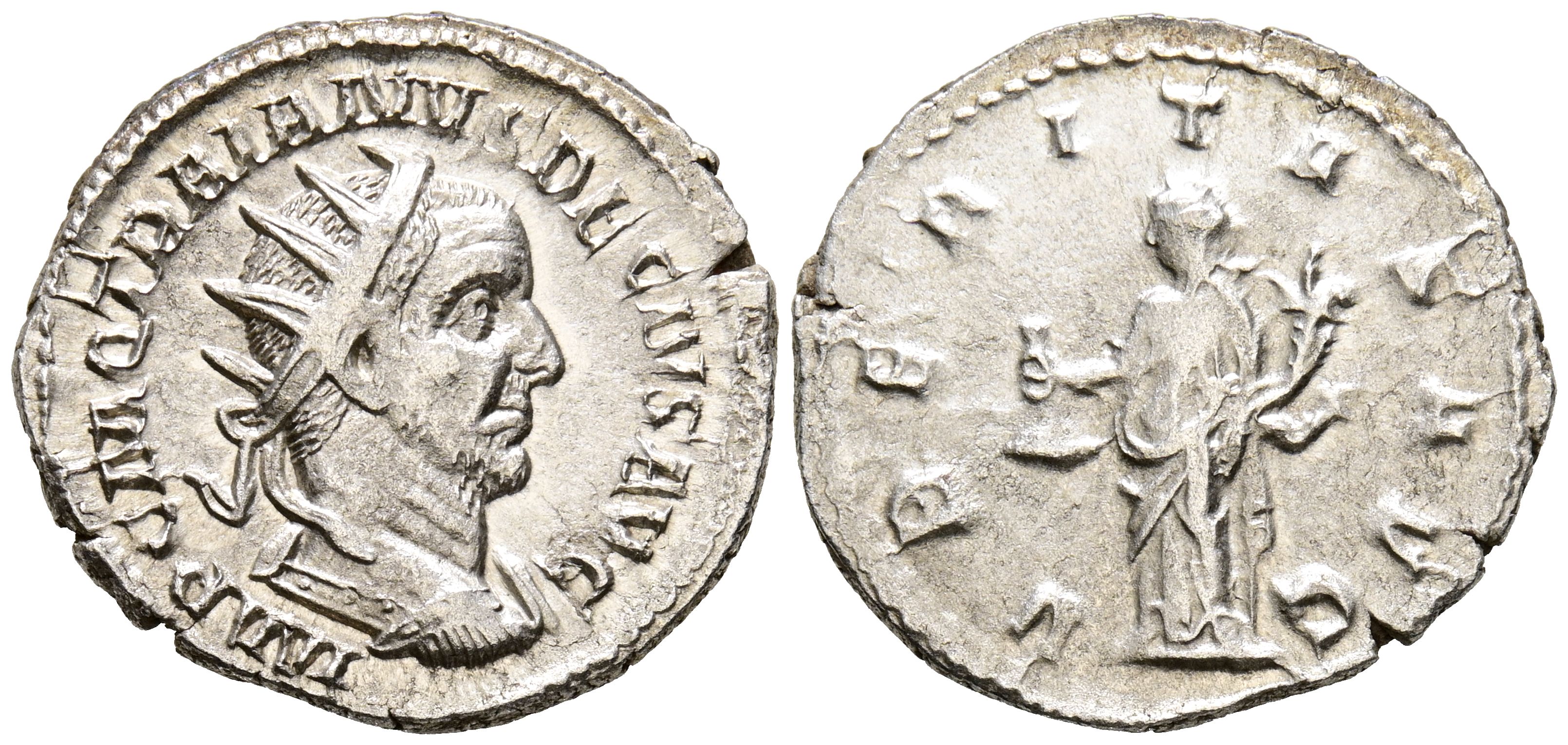 TRAJAN DECIUS. Antoninianus. (Ar. 3.75g/23mm). 294-251 AD Rome. (RIC 28). Obv: Radiant and draped bust of Trajan Decius facing right, around legend: IMP CMQ TRAIANVS DECIVS AVG. Rev: Uberitas standing left carrying cornucopia and sack of coins, around legend: VBERITAS AVG. Extremely Fine-/VF. Weak mintage on reverse.
