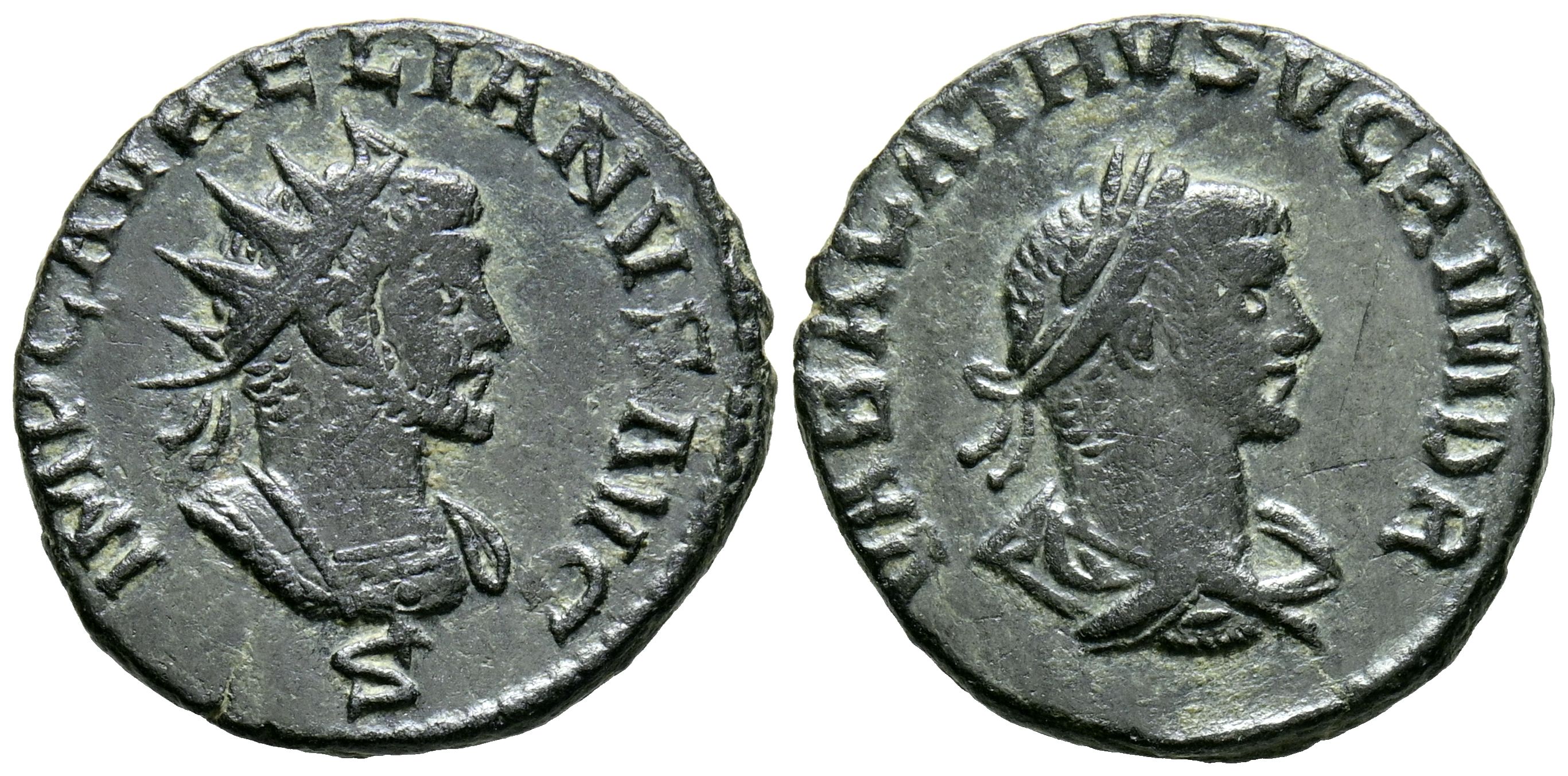 AURELIAN and VABALATUS. Antoninianus. (Ae. 3.11g/19mm). 270-272 AD Antioch. (RIC 381). Anv: Radiate and draped bust of Aurelian right, below S, around legend: IMP C AVRELIANVS AVG. Rev: Laureate and draped bust of Vabalathus right, around legend: VABALATHVS VCR IM D R. Very Fine.
