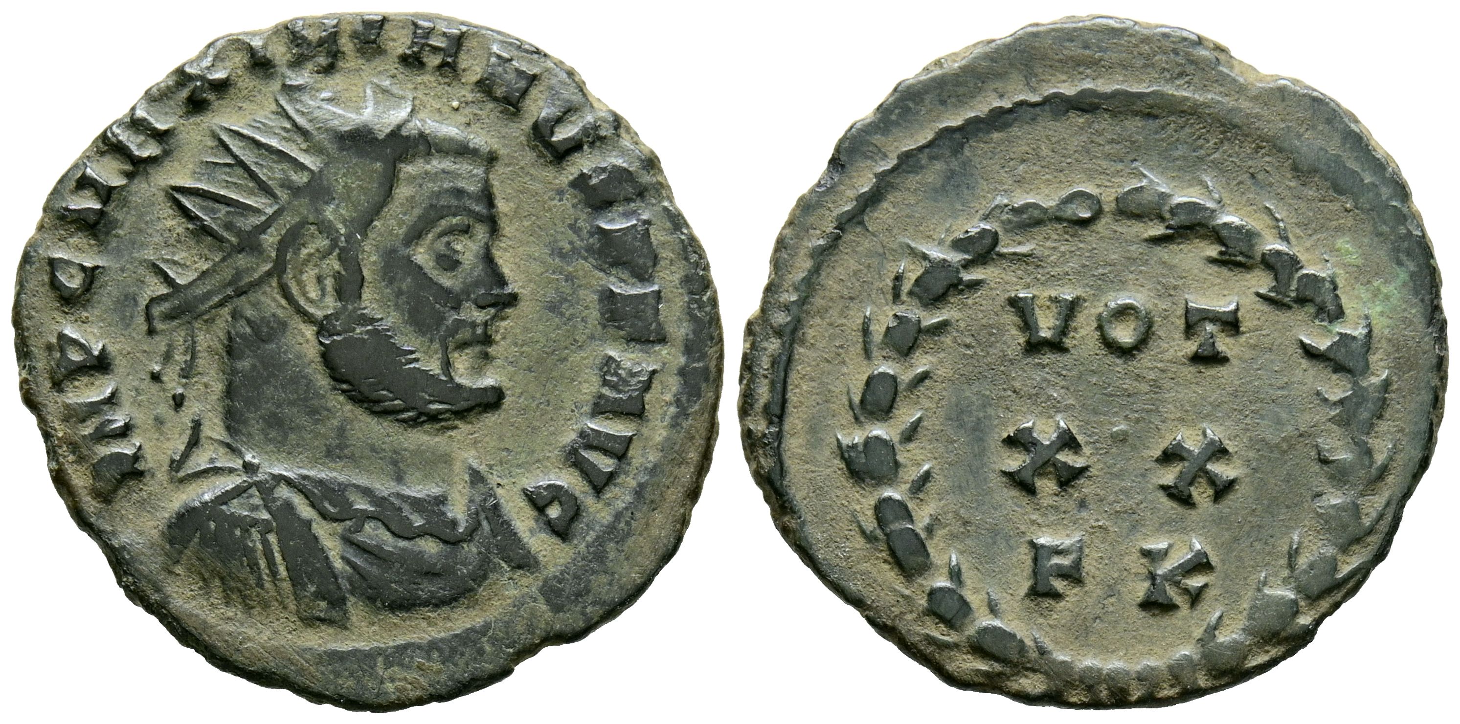MAXIMIAN I. Follis. (Ae. 2.71g/21mm). 303 AD Carthage. (RIC 37b). Anv: Radiated and draped bust of Maximian I to the right, around legend: IMP C MAXIMIANVS PF AVG. Rev: Legend: VOT/XX/FK, inside laurel wreath. Very Fine.