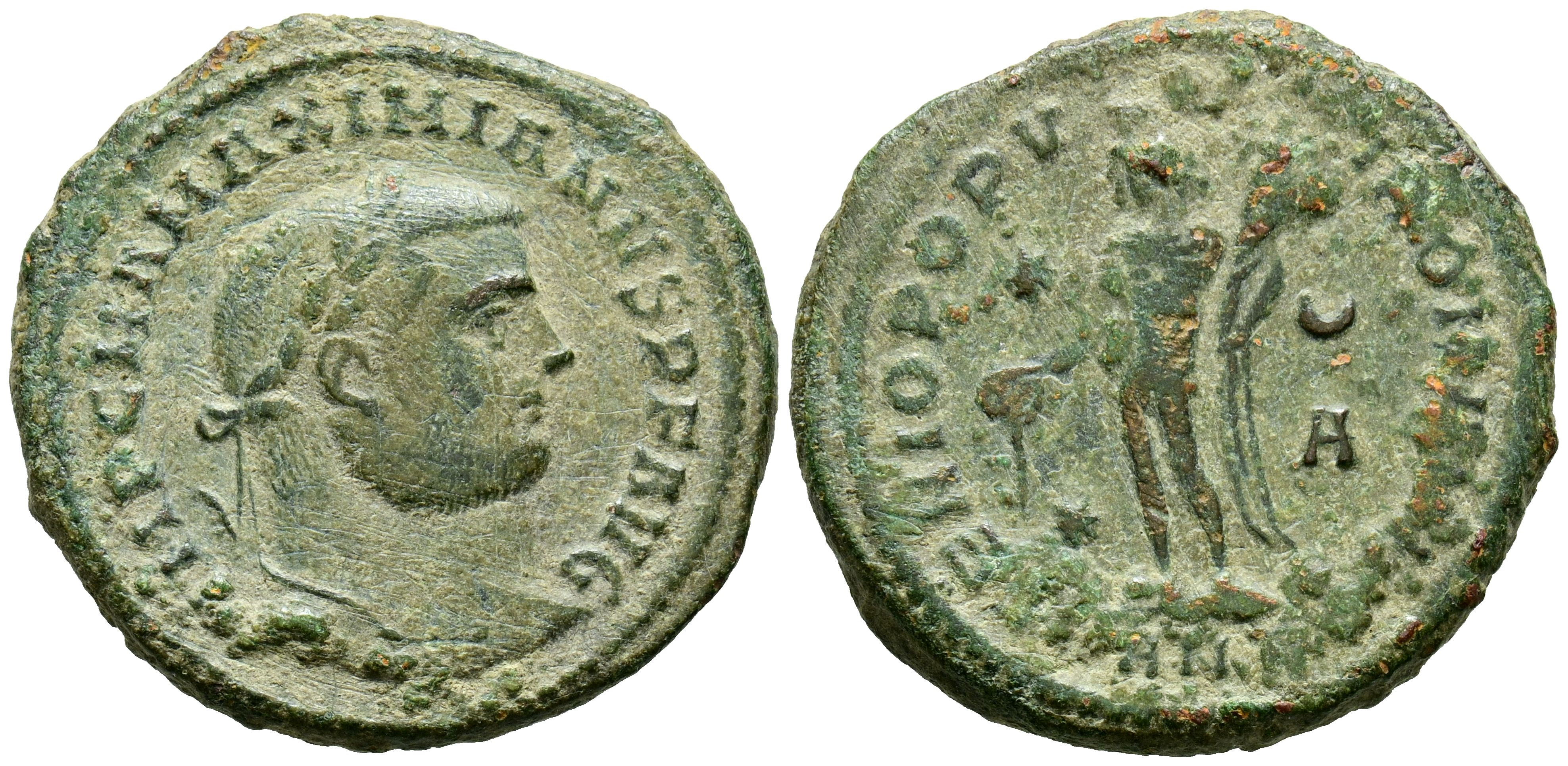 MAXIMIANUS HEGoodULEUS. Follis. (Ae. 10.37g/27mm). 298 AD Antioch. (RIC 50b). Anv: Laureate head of Maximian Herculeus right, around legend: IMP CMA MAXIMIANVS PF AVG. Rev: Genius standing left carrying patera and cornucopia, in field A; stars and crescent, in exergue: ANT, around legend: GENIO POPVLI ROMANI. Very Fine.