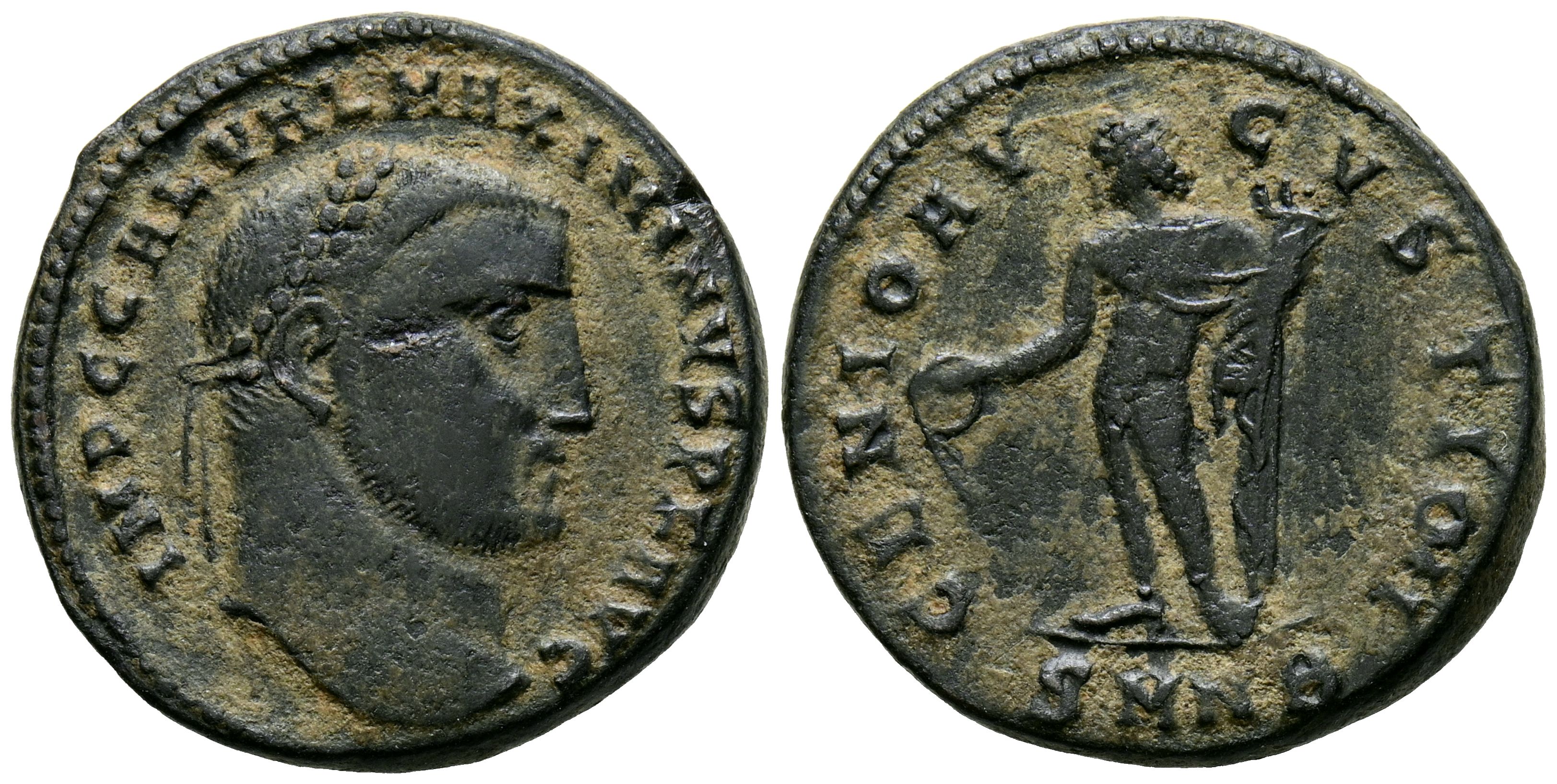 GALLERY. Follis. (Ar. 7.01g/23mm). 308-310 AD Nicomedia. (RIC 54a). Anv: Laureate head of Galerius to the right, around legend: IMP C GAL VAL MAXIMIANVS PF AVG. Rev: Genius on the left carrying a patera and cornucopia, in exergue: SMNA, around legend: GENIO AVGVSTI. Very Fine-.