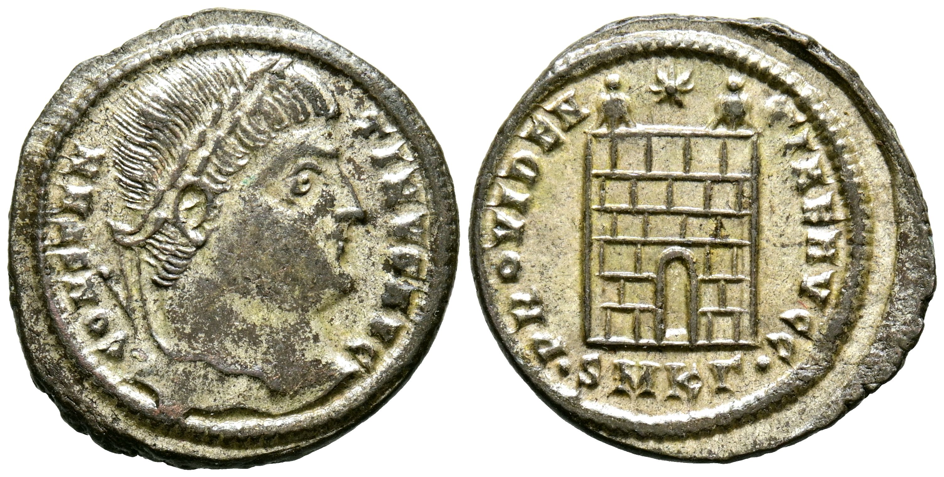 CONSTANTINE I. Follis. (Ae. 3.57g/20mm). 326-327 AD Cyzicus. (RIC 44). Obv: Laureate head of Constantine I right, around legend: CONSTANTINVS AVG. Rev: Camp gate, above star between two turrets, in exergue: SMKr, around legend: PROVIDENTIAE AVGG. Extremely Fine. Remains of original silver plating.