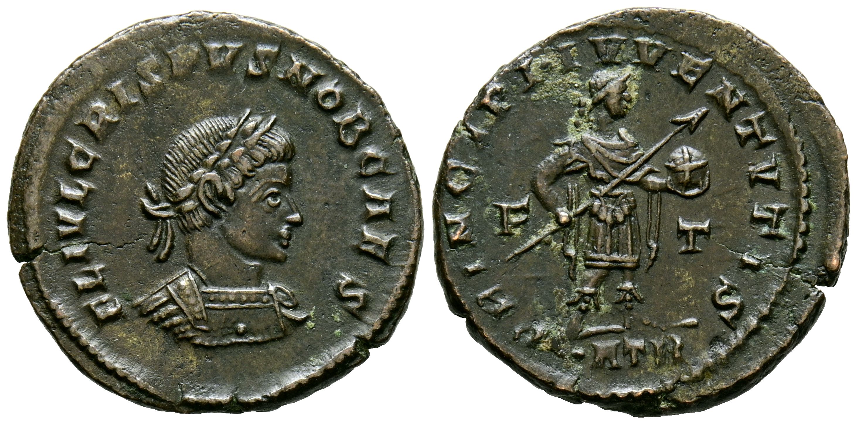 CRISPO. Follis. (Ae. 3.24g/20mm). 317-318 AD. Treveris. (RIC 169). Obv: Laureate and cuirassed bust of Crispus right, surrounding legend: FL IVL CRISPVS NOB CAES. Rev: Crispus in military dress with lance and globe right; in field: FT, in exergue: ATR, surrounding legend: PRINCIPI IV VENTVTIS. VF+.