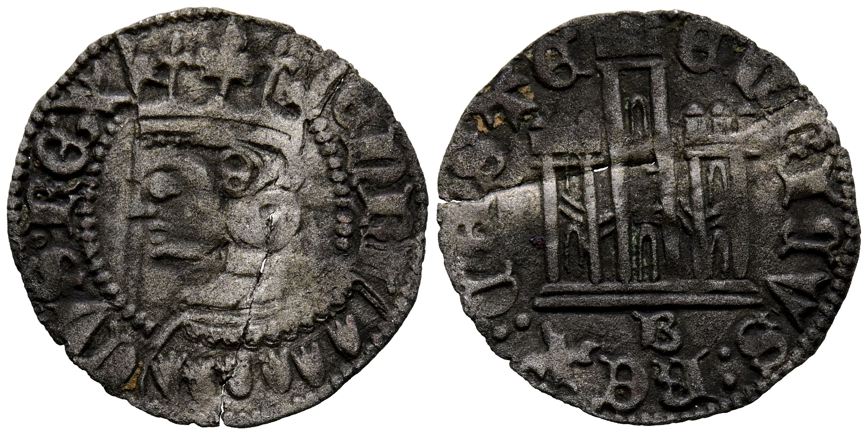 HENRY II (1368-1379). Crowned. (Ve. 0.93g/20mm). Burgos. (Imperatrix E2:20.4; FAB-486). Obv: Crowned bust of Henry II left, around legend: ENRICVS REX. Rev: Castle, below B, around legend: ENRICV REX CASTE. VF. Crack due to folding.