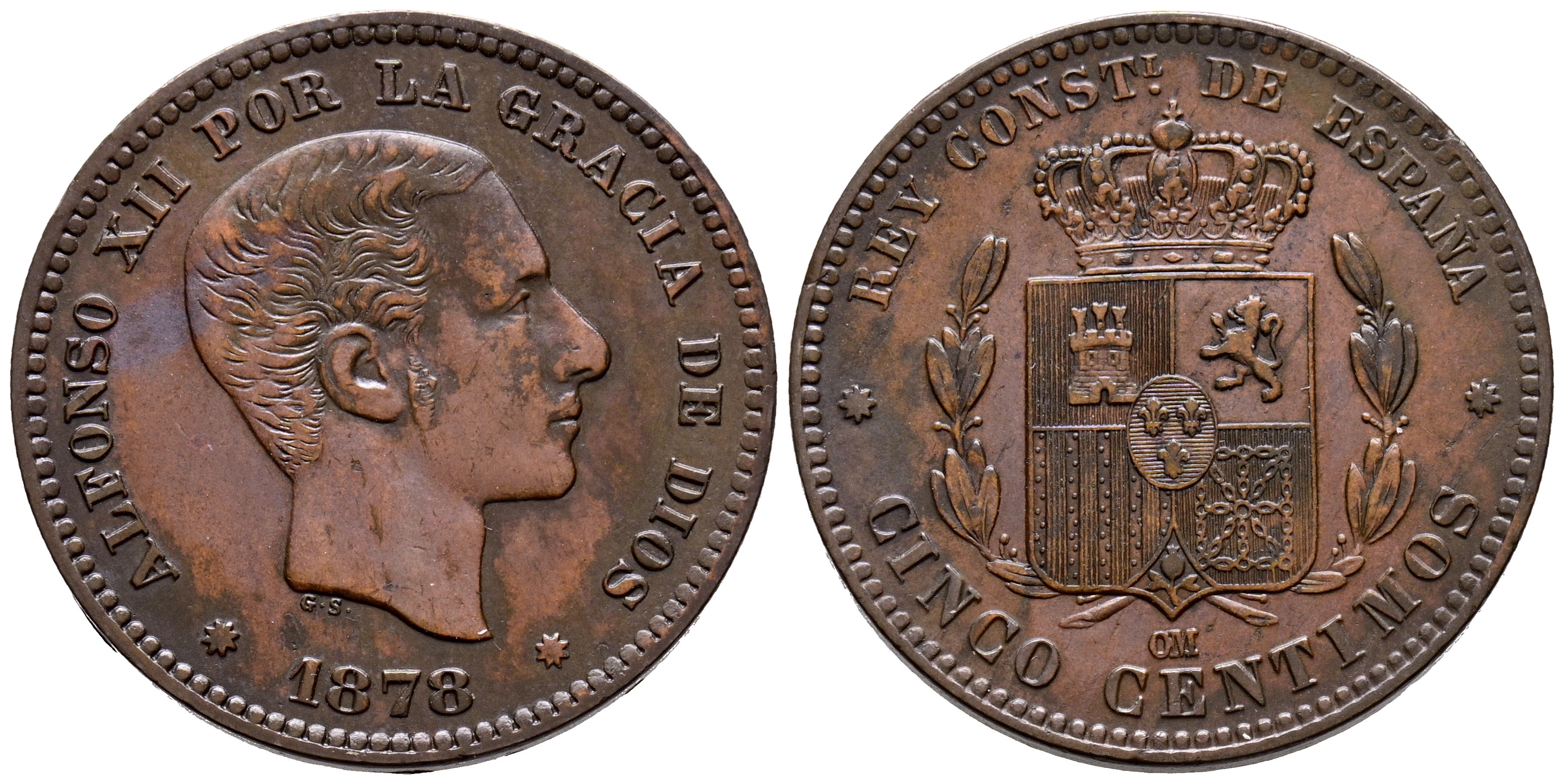 ALFONSO XII (1874-1885). 5 Cents. (Ae. 4.68g/25mm). 1878. Barcelona OM. (Cal-2019-5). Good Very Fine. Attractive color.