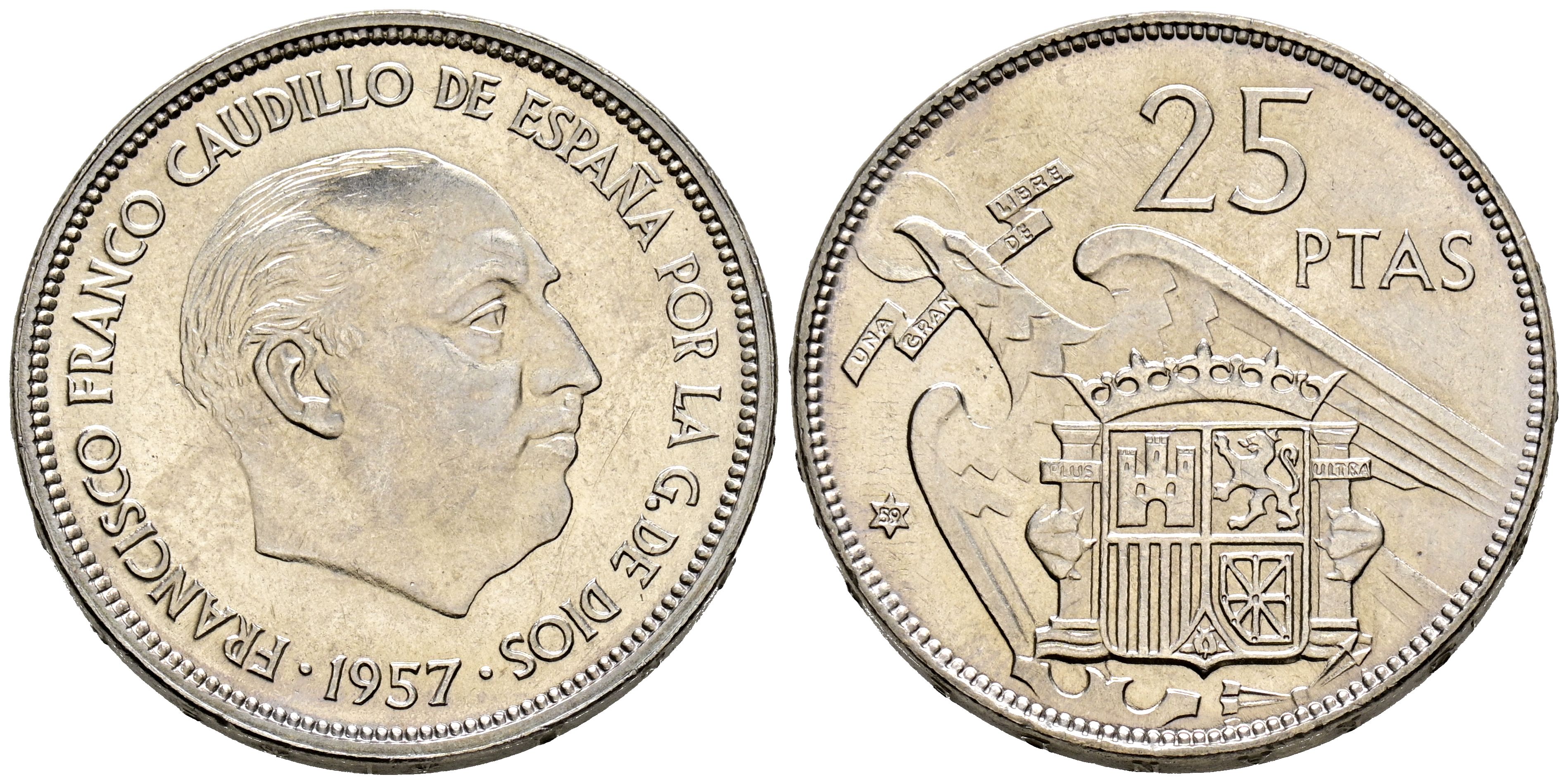 SPANISH STATE (1936-1975). 25 Pesetas. (Ni. 8.57g/27mm). 1957 * 59. Madrid. (Cal-2019-117). Uncirculated-. Original shine.