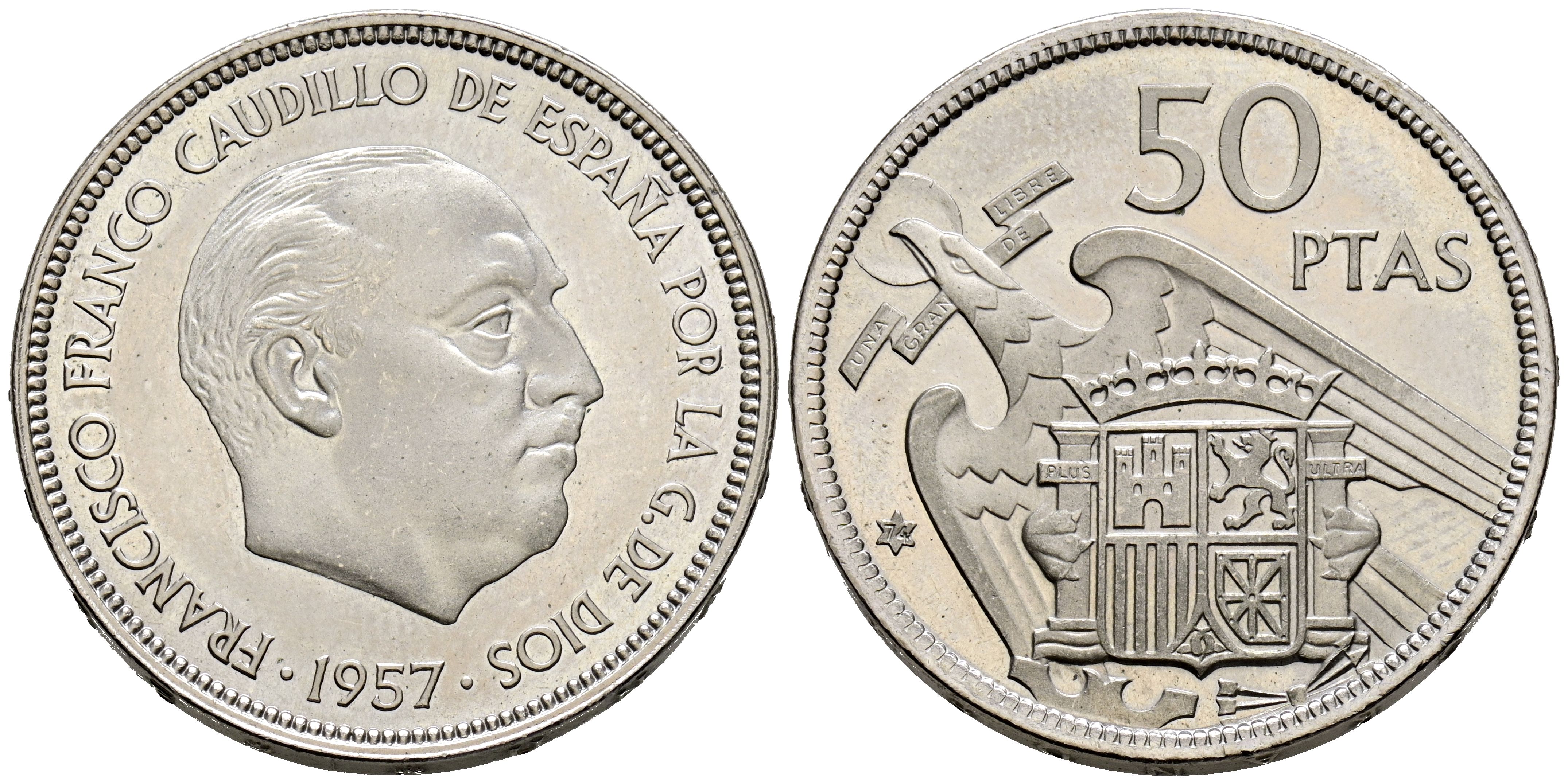 SPANISH STATE (1936-1975). 50 Pesetas. (Ni. 12.65g/30mm). 1957 *74. Madrid. (Cal-2019- 143). Uncirculated. Magnificent piece.
