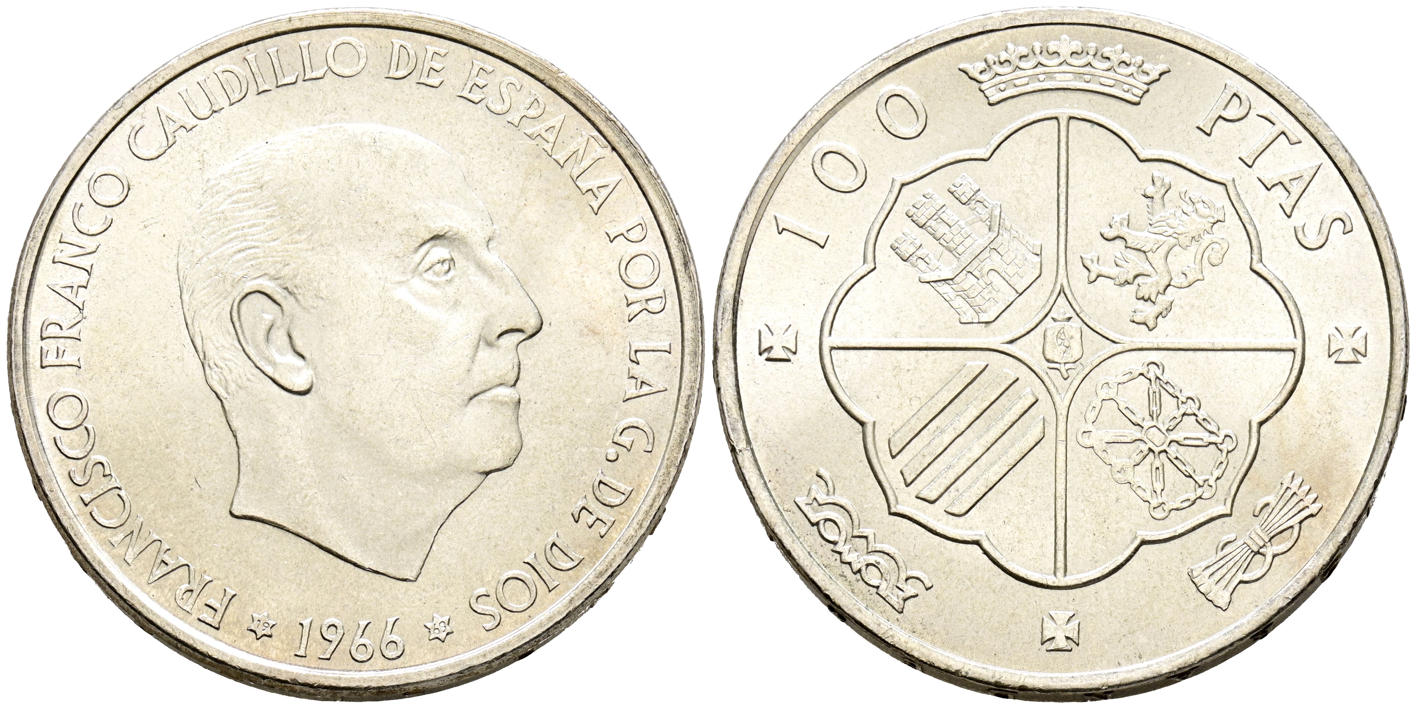 SPANISH STATE. 100 Pesetas. (Ar. 19,16g/34mm). 1966 *19-69. Madrid. (Cal-2019-148). Curved stick. Good Extremely Fine.