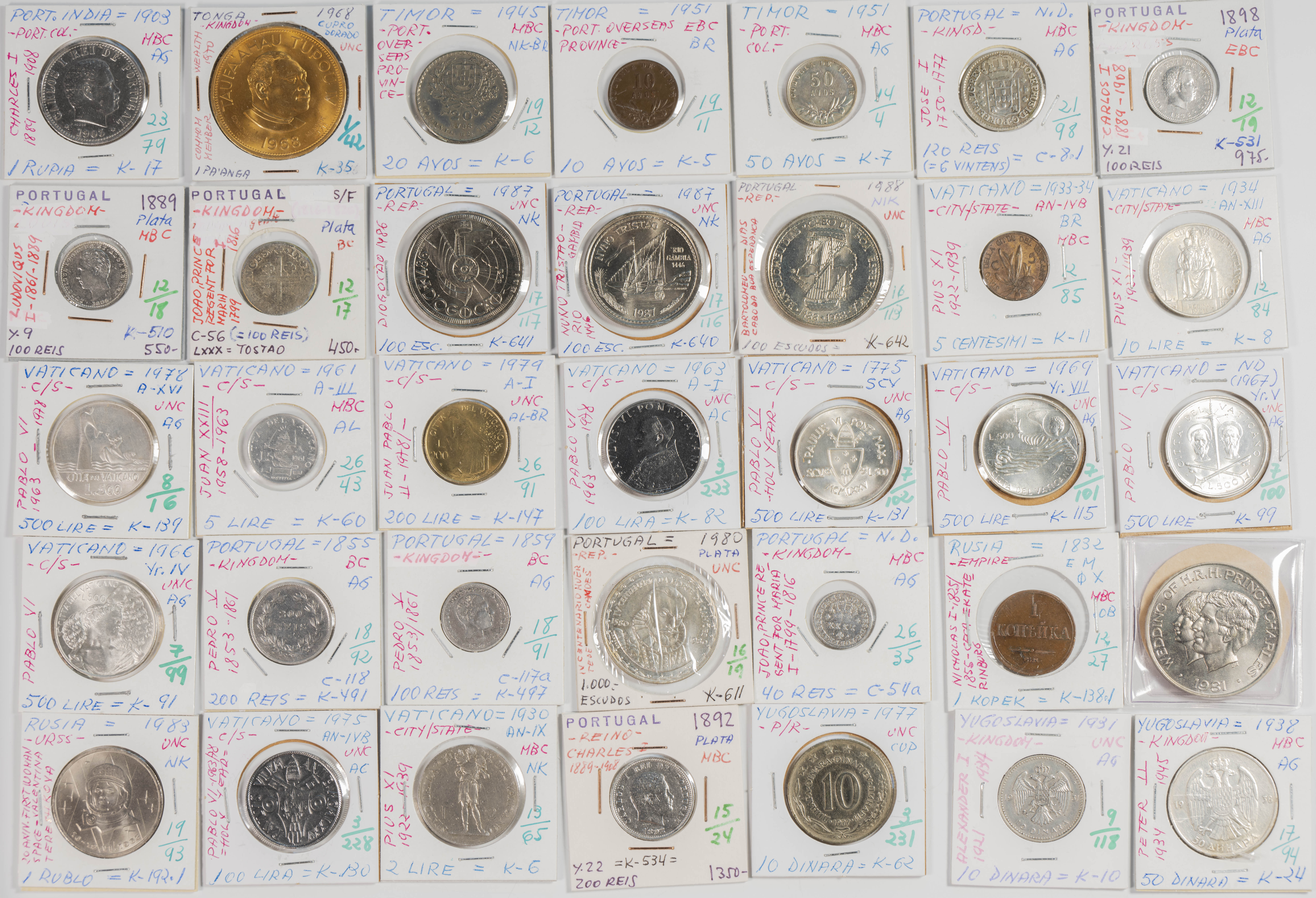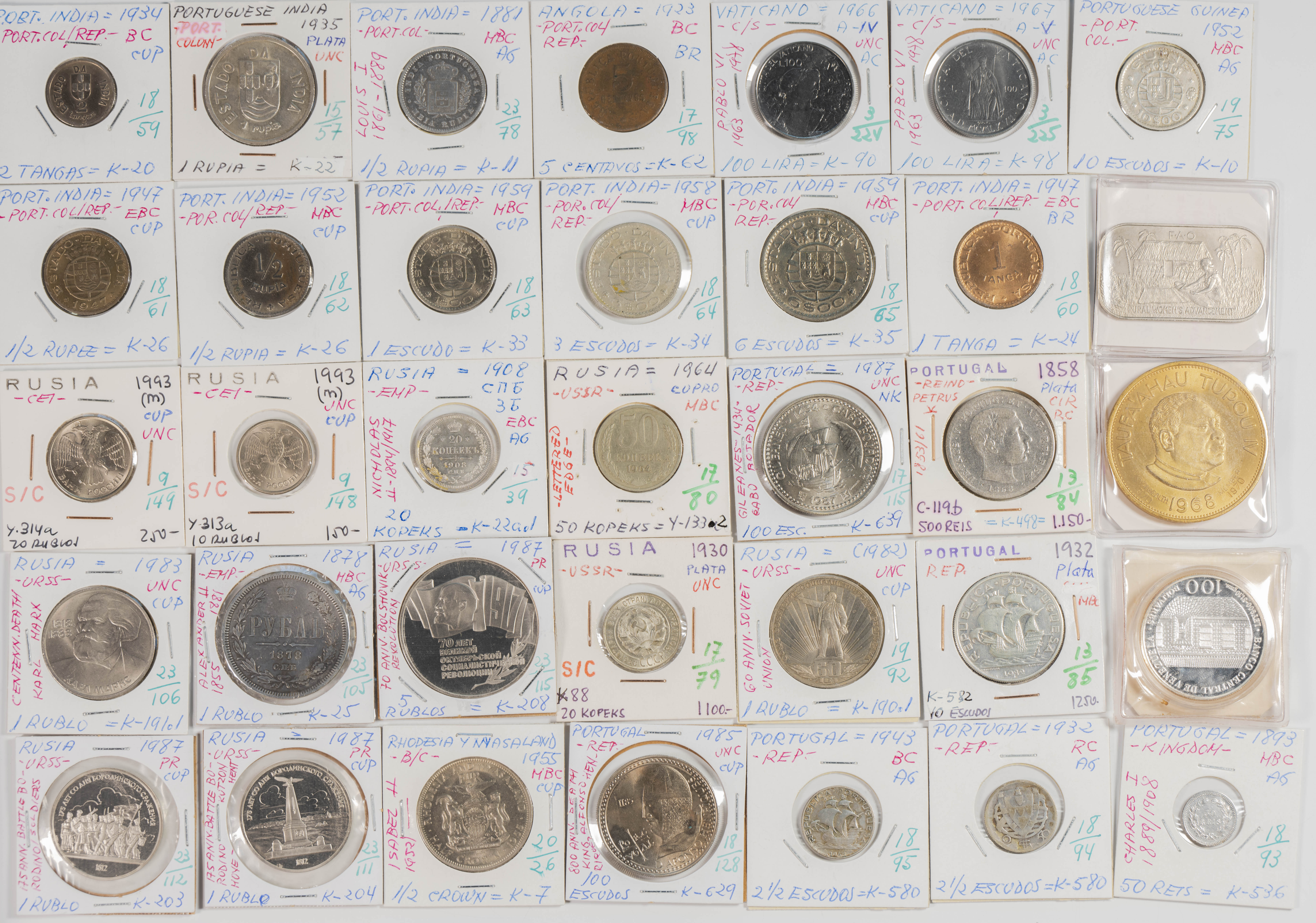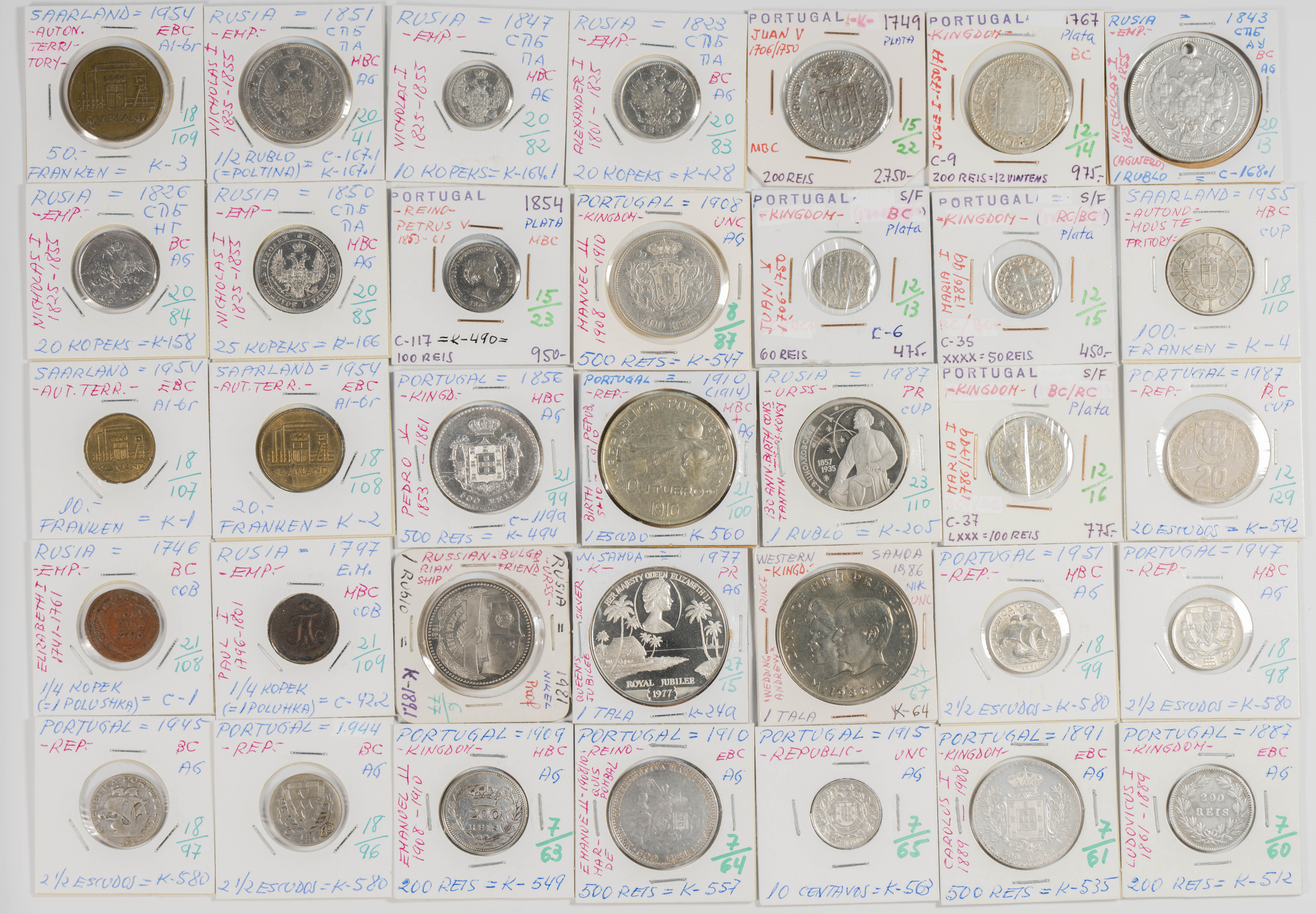 Magnificent collection made up of more than 3000 coins from different periods, mainly from the 19th and 20th centuries, although we also find a good number of examples from the 18th century with a huge variety of countries represented. The typology, theme, modules and dates of the collection are very extensive, highlighting, among others, the enormous quantity of pieces in silver and among them a good number of modules of the troy ounce or duro type. By country we find coins from the 5 continents with special mention for countries of the Commonwealth and former colonies. A great representation of European coins, among which we also find Spanish coins. The set is in a medium/high state of conservation in general, being the result of the work of a single collector and where we hardly find any repeated pieces. ESSENTIAL TO EXAMINE, the lot is sold as is.