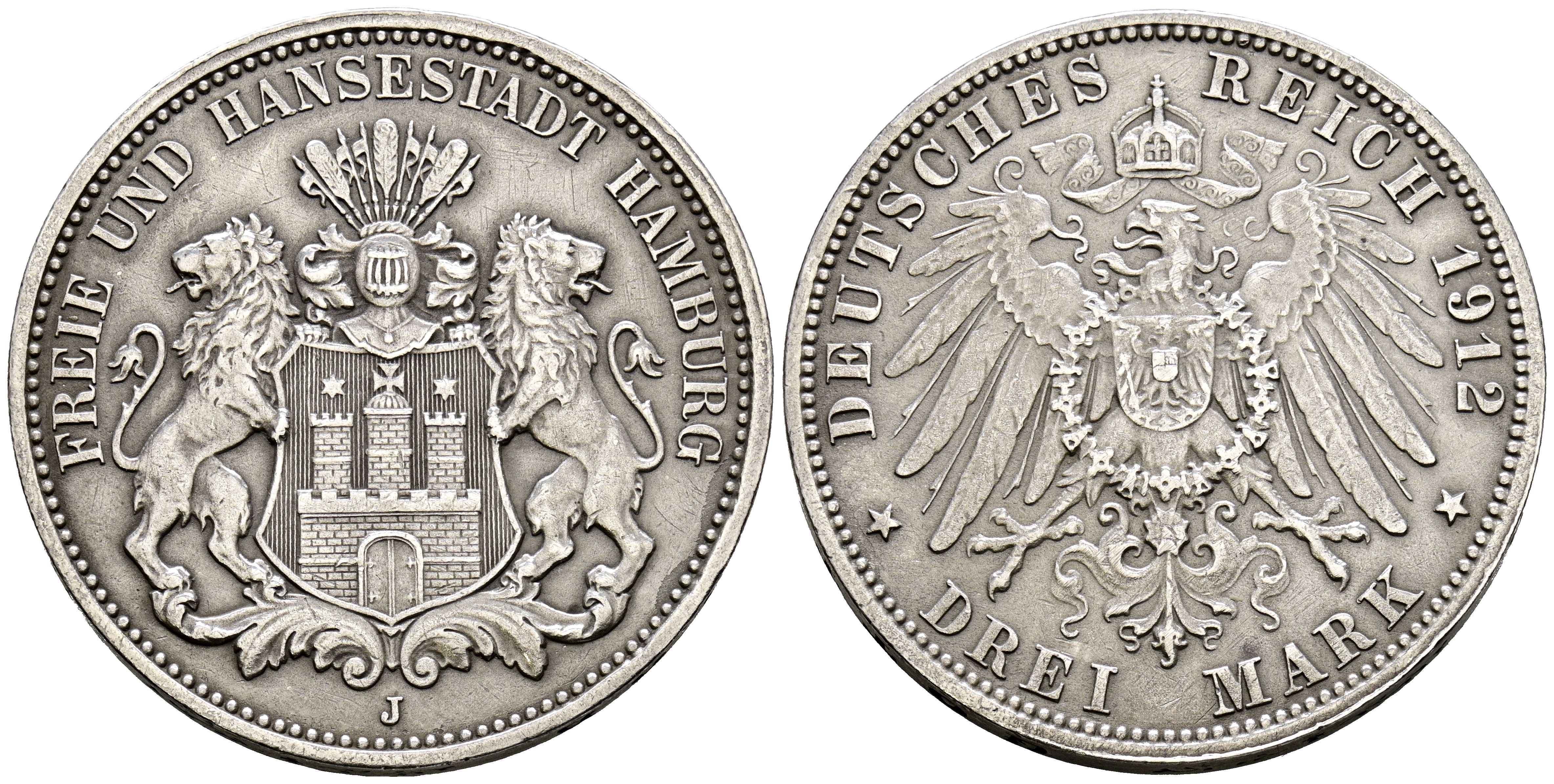 GERMANY. 3 Mark (Ar. 16,56g/33mm). 1912. Free City of Hamburg. J. (Km#296). VF+.