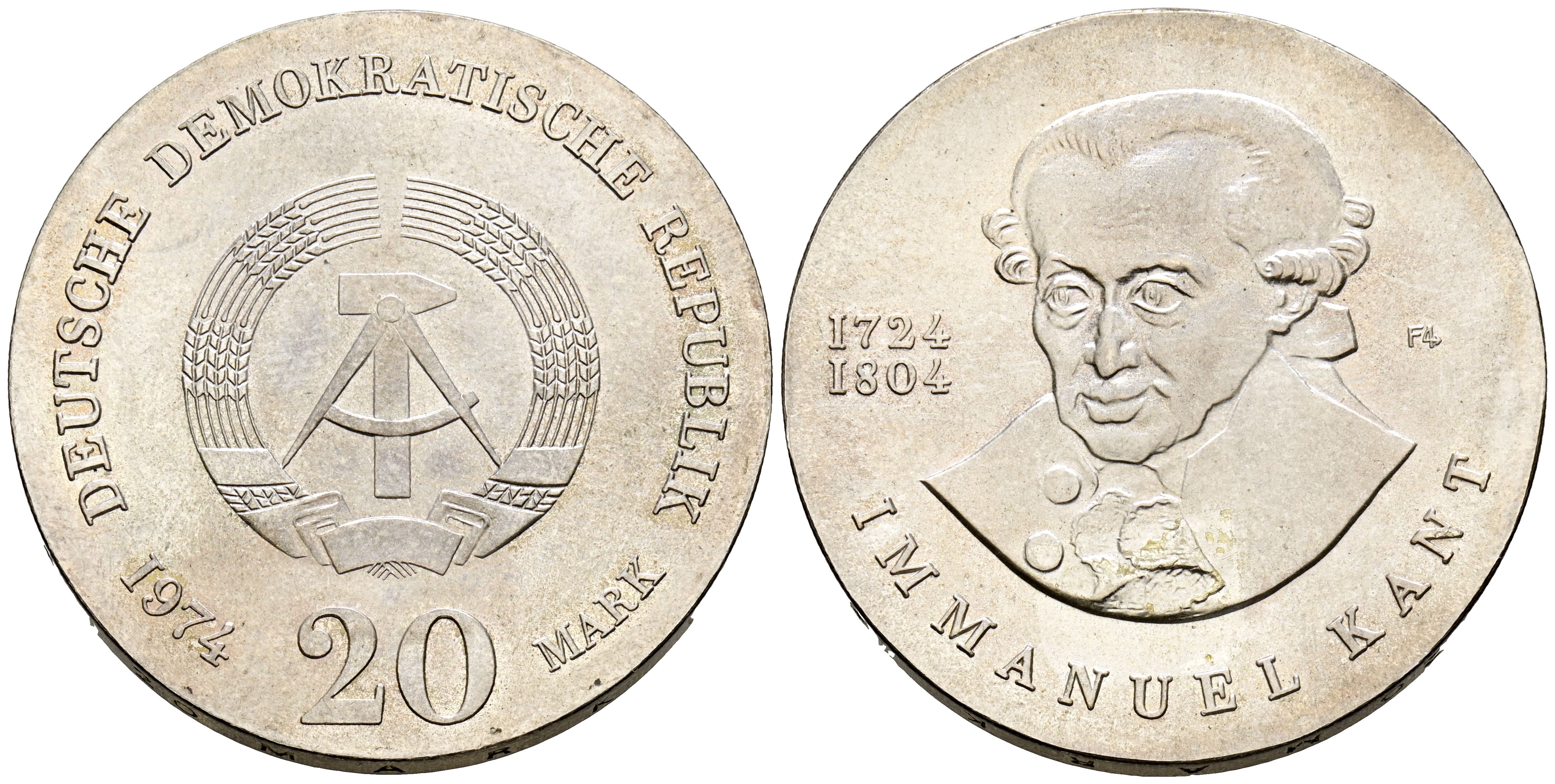 GERMANY. 20 Mark (Ar. 20.95g/33mm). 1974. GDR. Immanuel Kant. (Km#53). Good Extremely Fine.