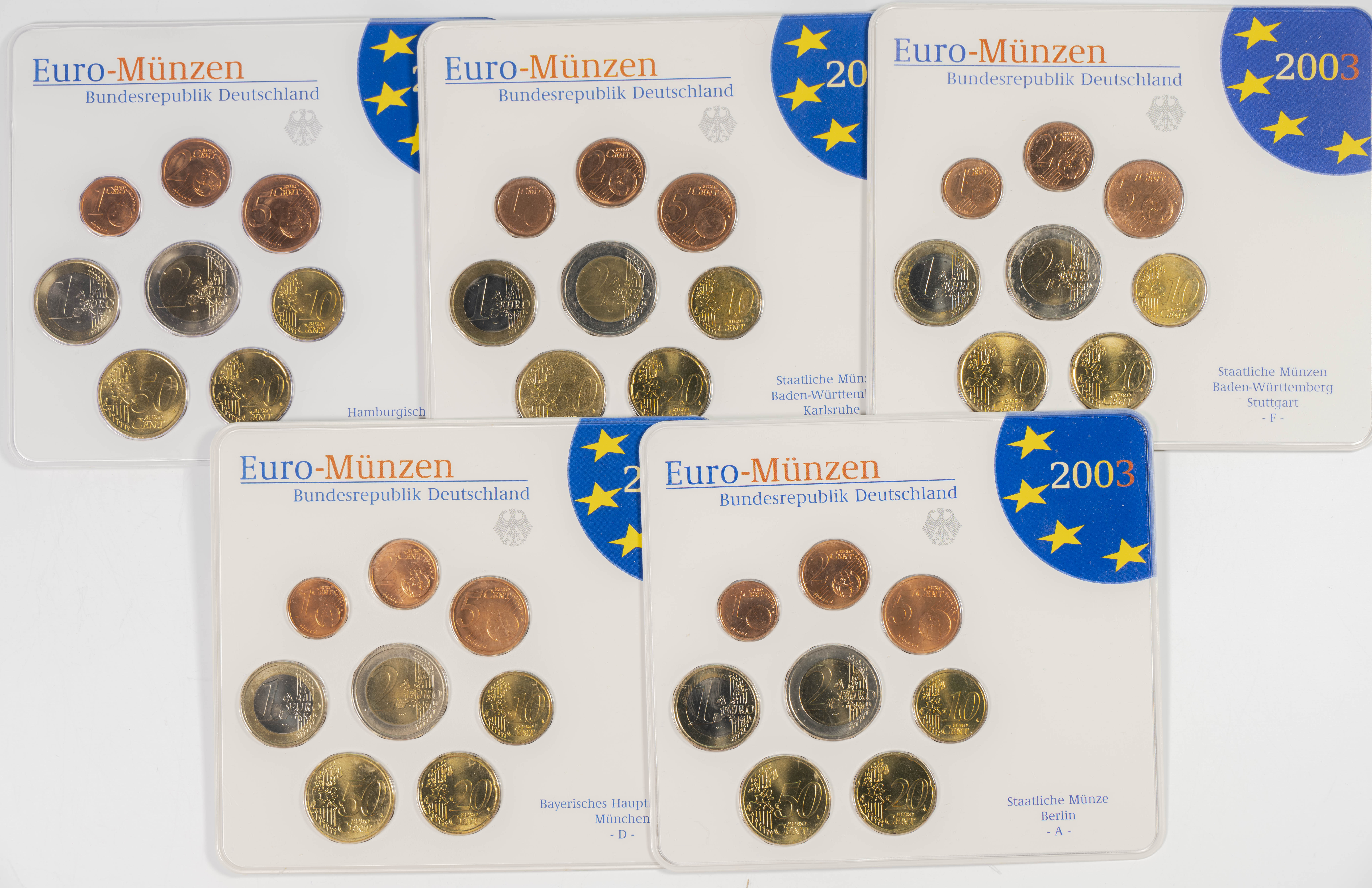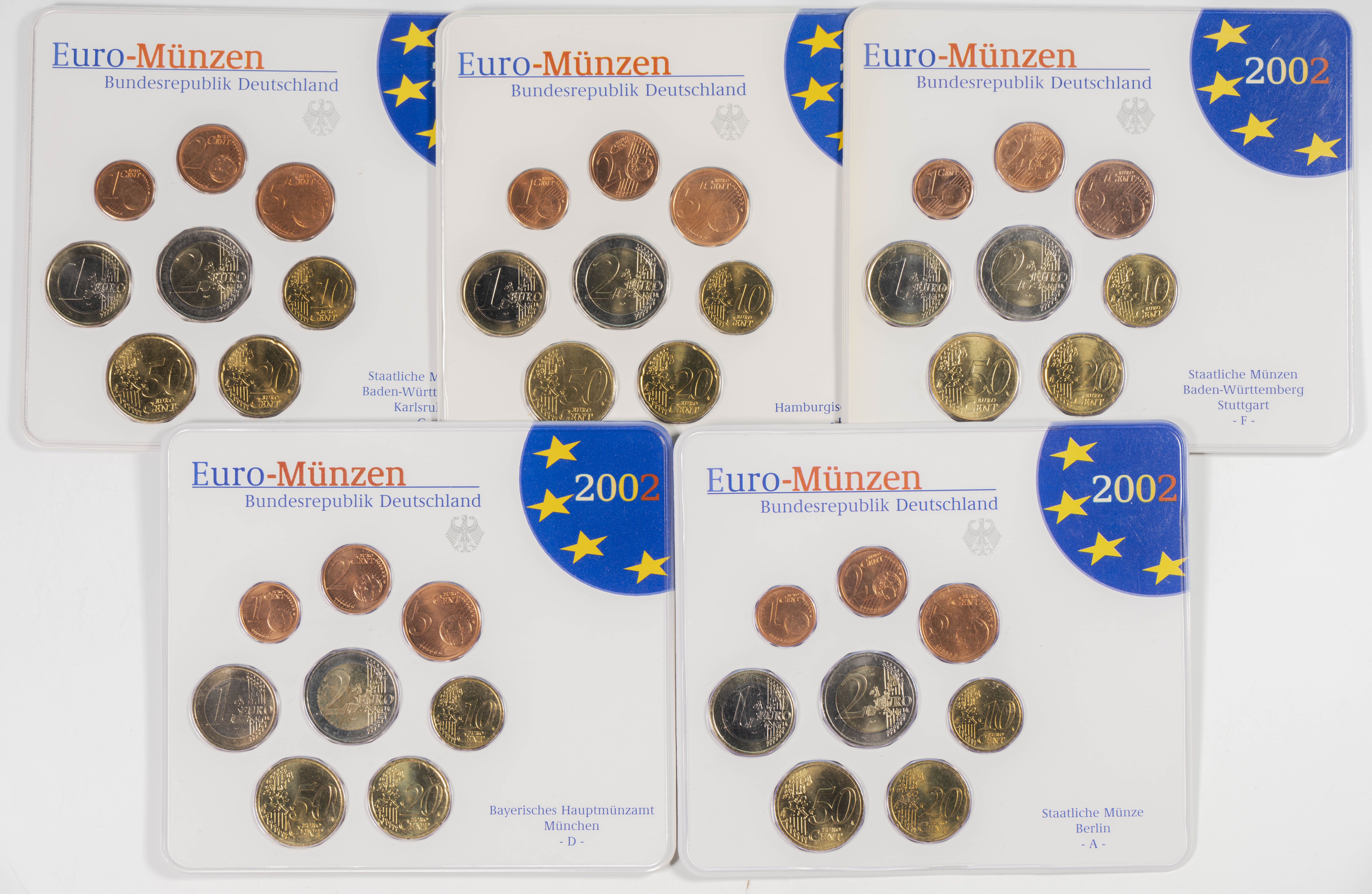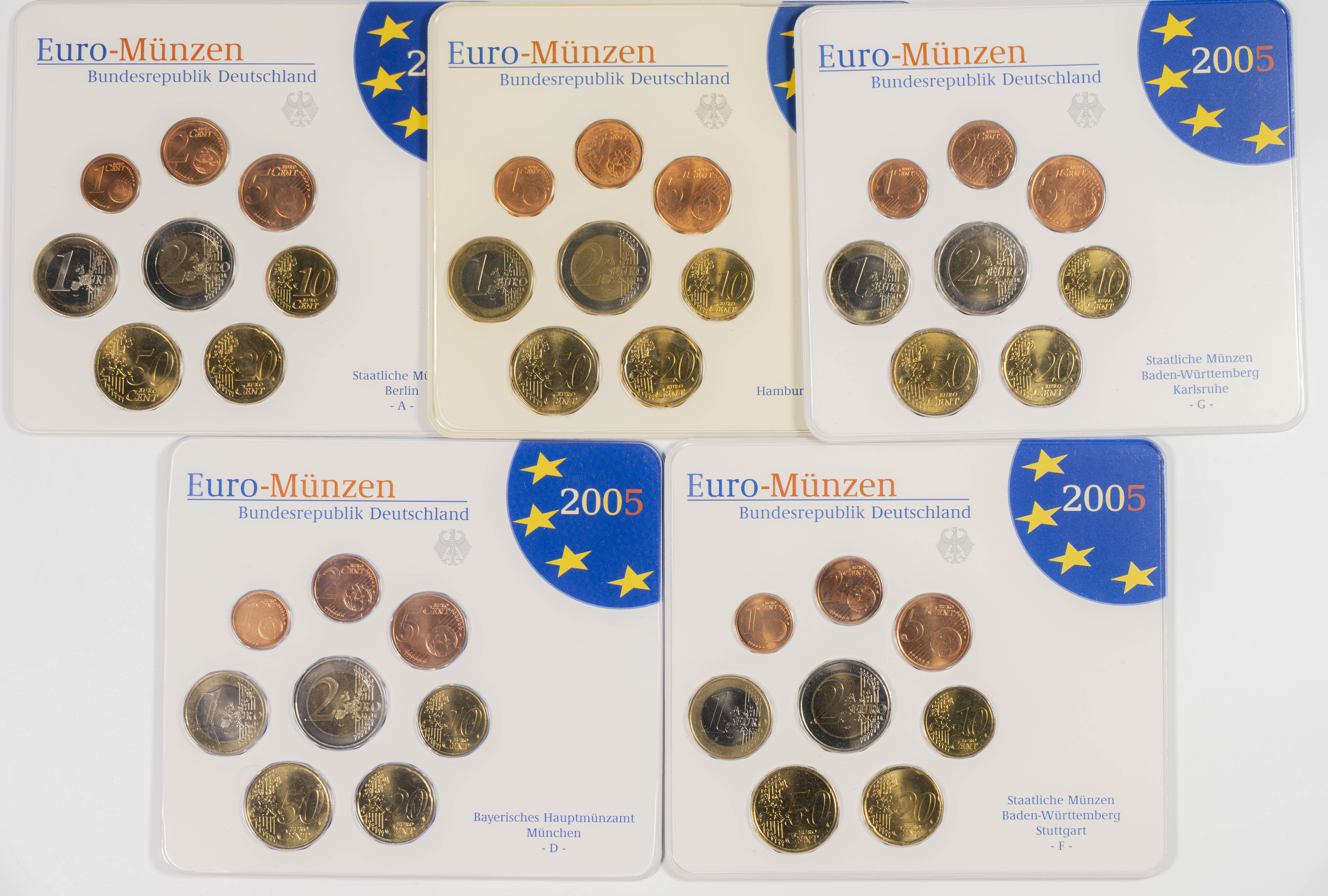 GERMANY. Set of 45 coins from the years 2002, 2003, 2004, 2005, 2006 and 2007 with all the minting mints: Berlin (A), Munich (D), Stuttgart (F), Karlsruhe (G) and Hamburg (J). Noteworthy is the duplication of the €2 value in the blisters from 2006 and 2007. WORTH EXAMINING.