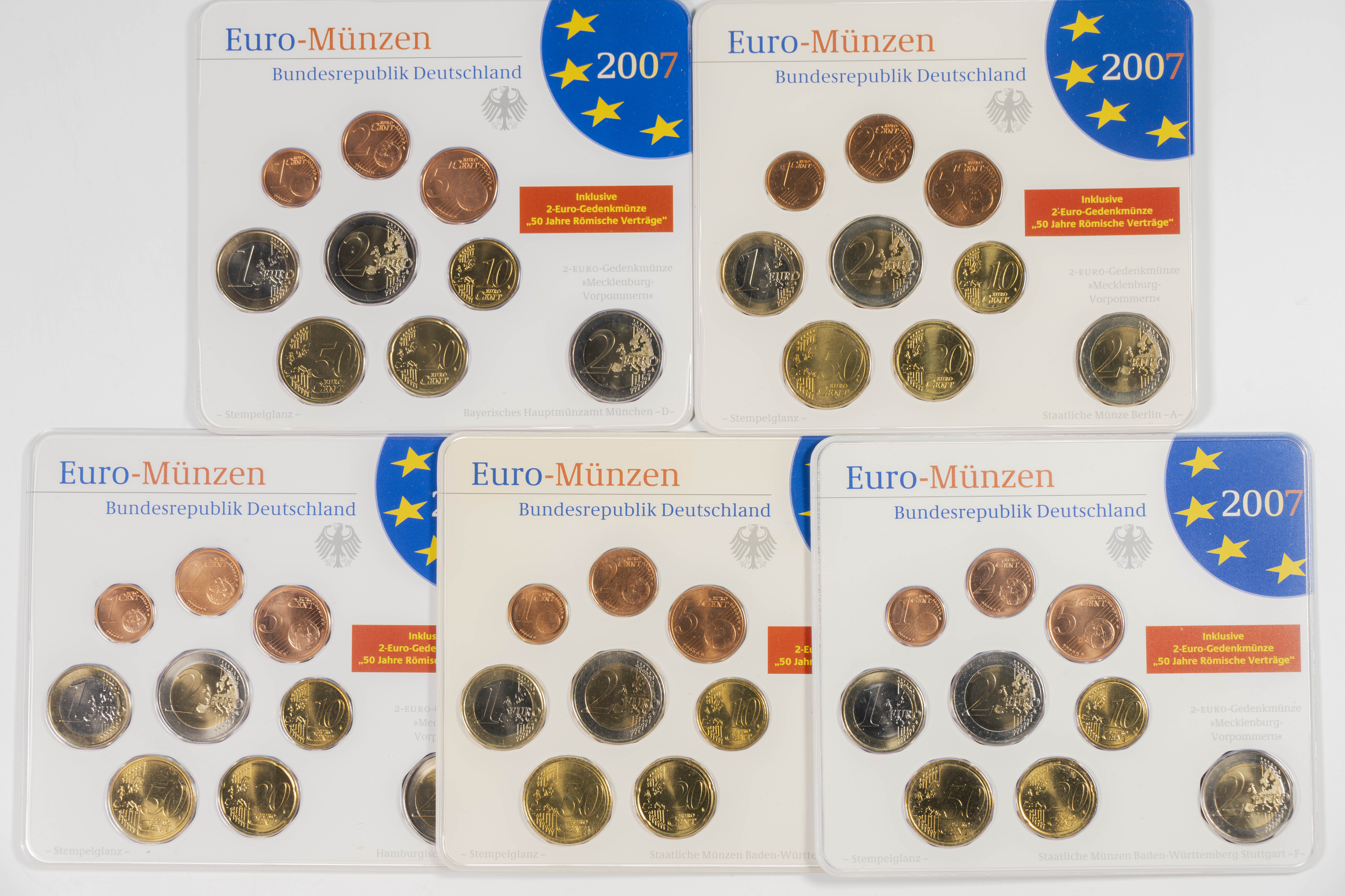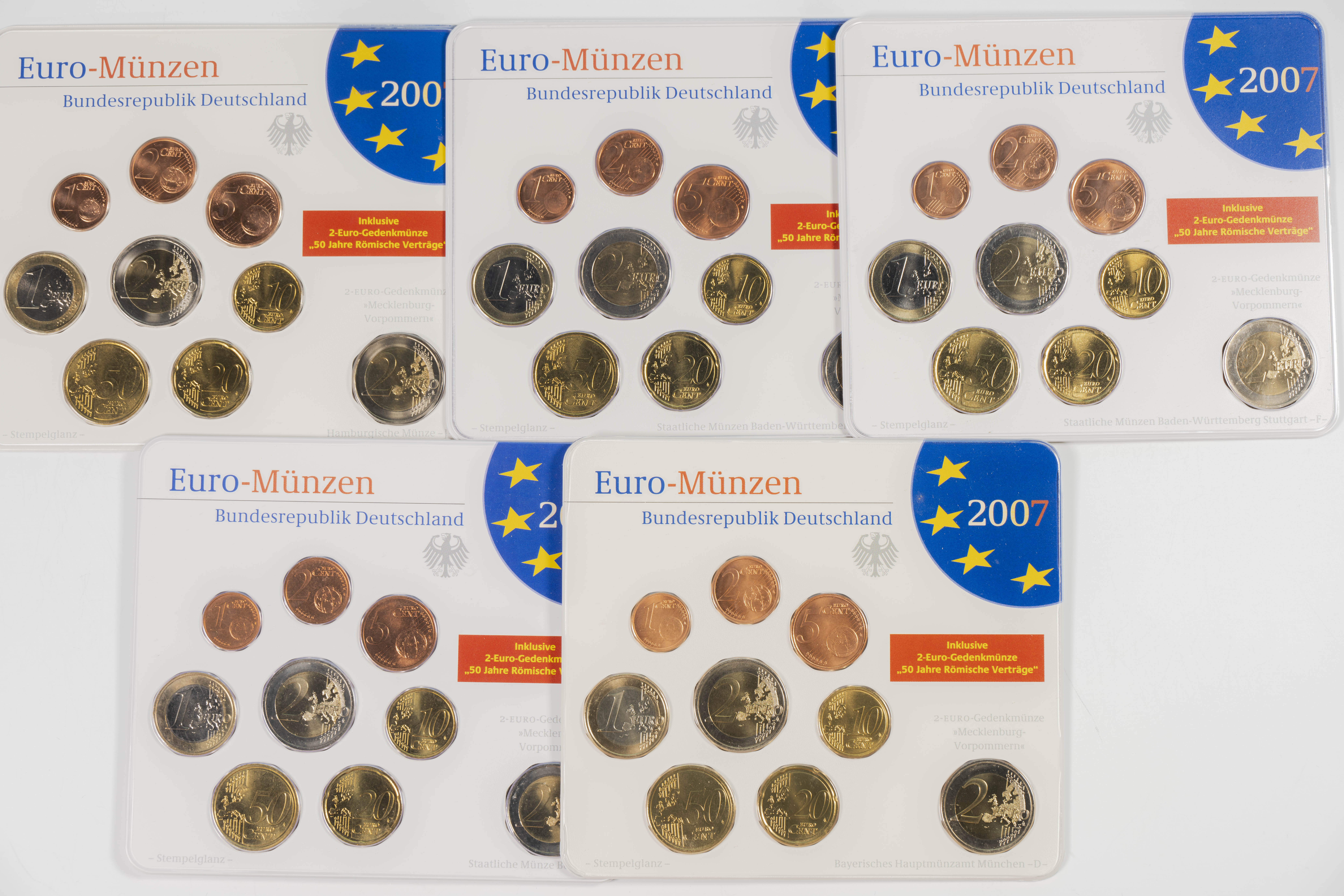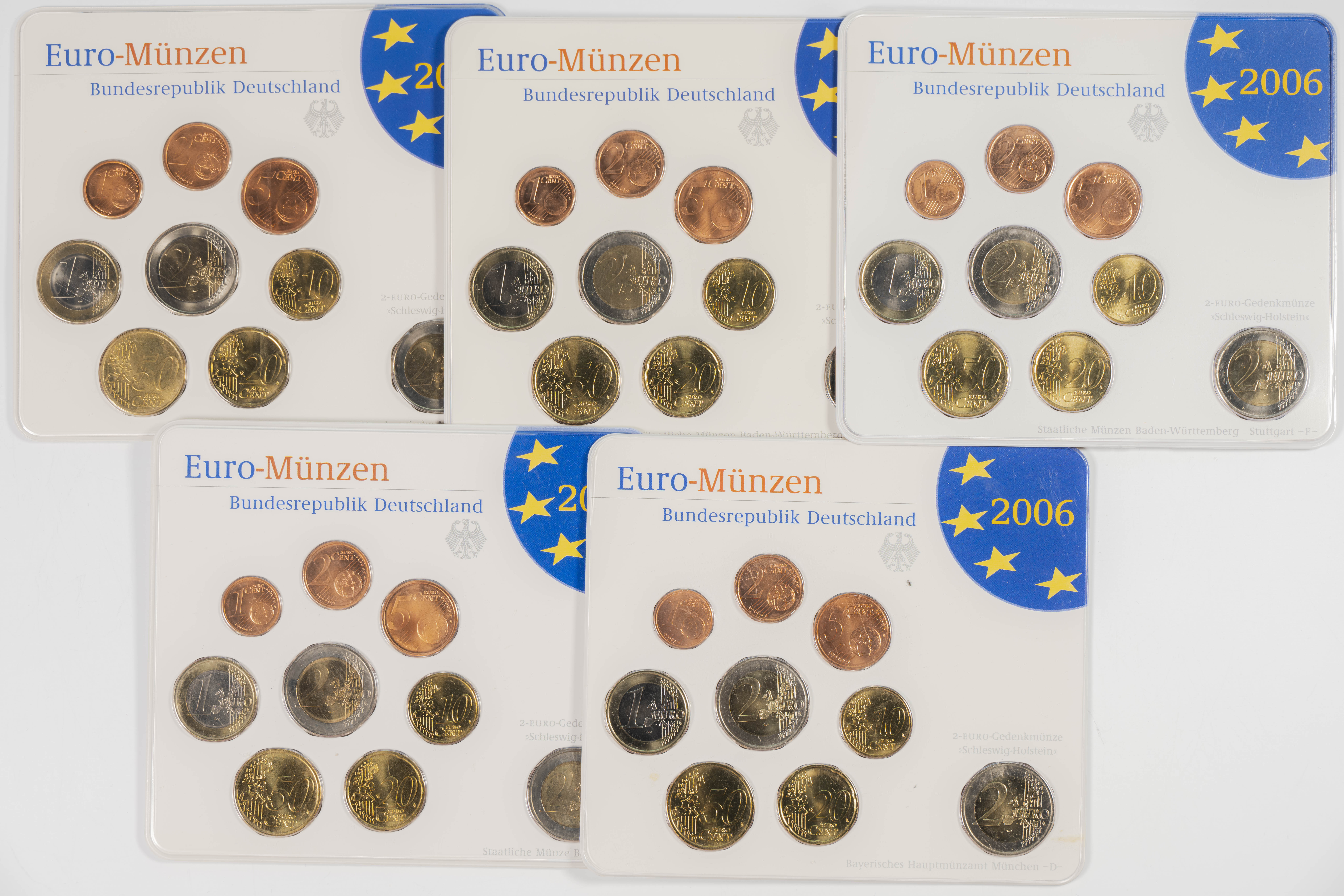 GERMANY. Set of 45 coins from the years 2002, 2003, 2004, 2005, 2006 and 2007 with all the minting mints: Berlin (A), Munich (D), Stuttgart (F), Karlsruhe (G) and Hamburg (J). Noteworthy is the duplication of the €2 value in the blisters from 2006 and 2007. WORTH EXAMINING.