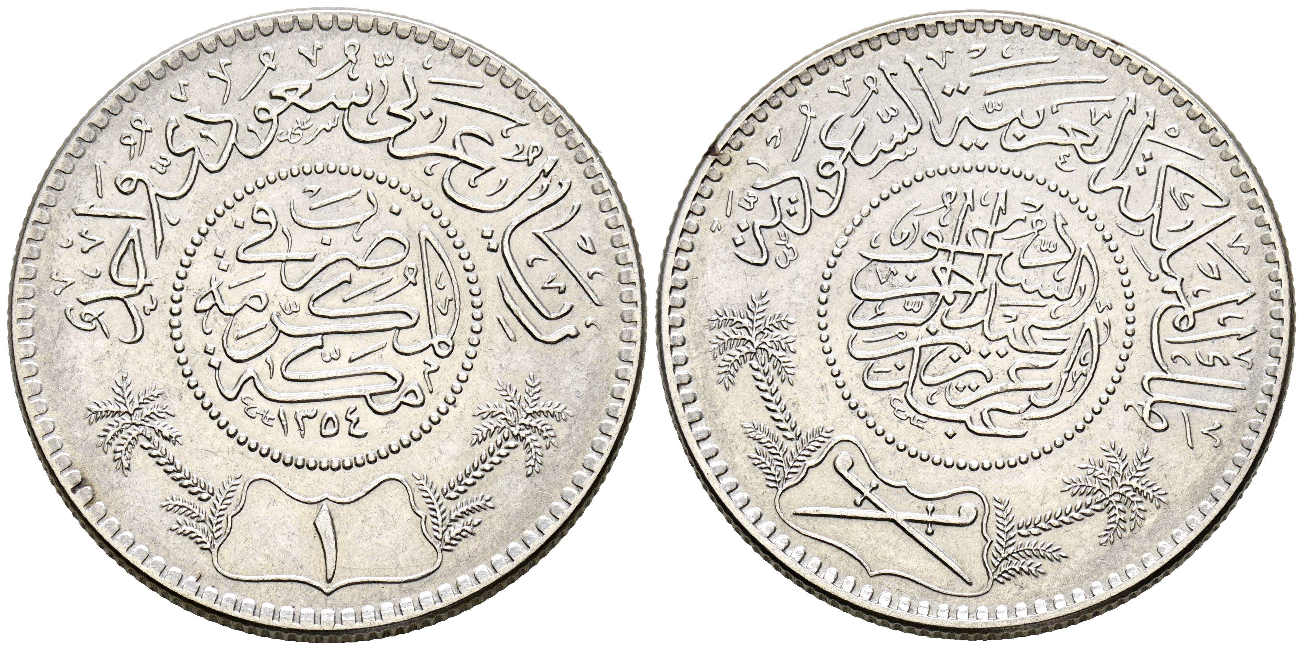 SAUDI ARABIA. 1 Riyal. (Ar. 11.63g/30mm). 1935. (1354H). Ibn Sa'ud. (Km#18). Extremely Fine.