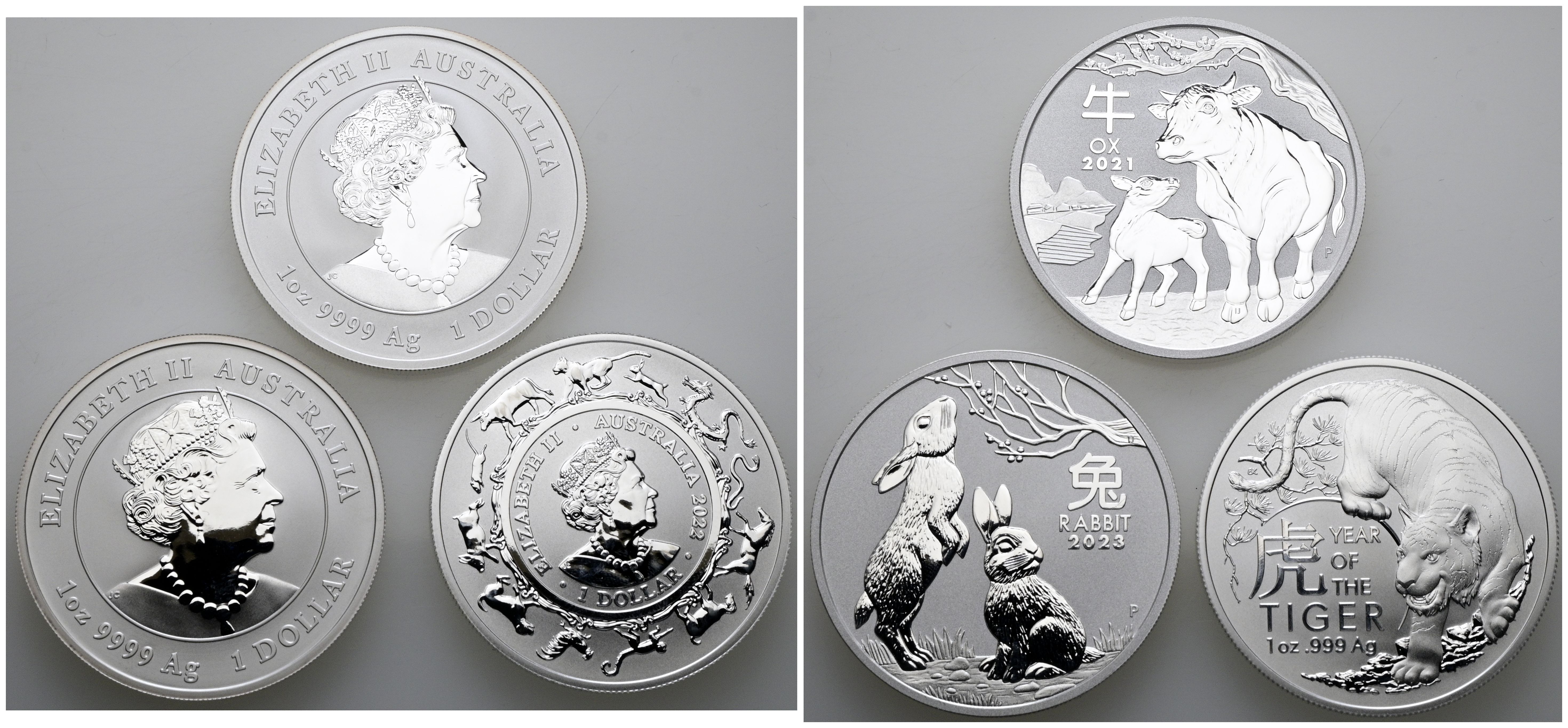 AUSTRALIA. Set of 3 ounces of pure silver (1 Dollar) minted in 2021, 2022 and 2023. Chinese Zodiac series. Uncirculated. Includes capsules.