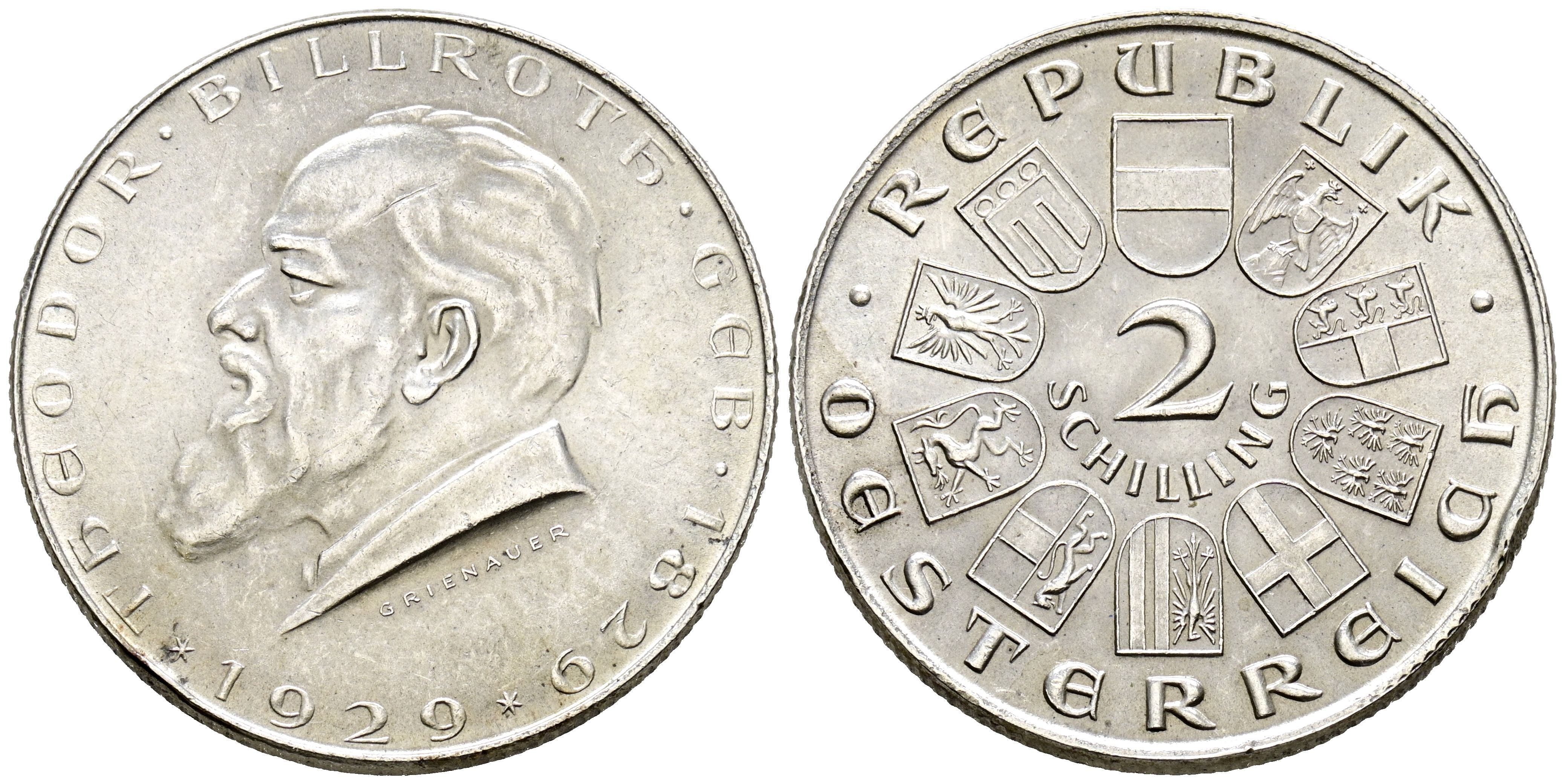 AUSTRIA. 2 Schilling (Ar. 11.95g/29mm). 1929. Theodor Billroth. (Km#2844). Extremely Fine.
