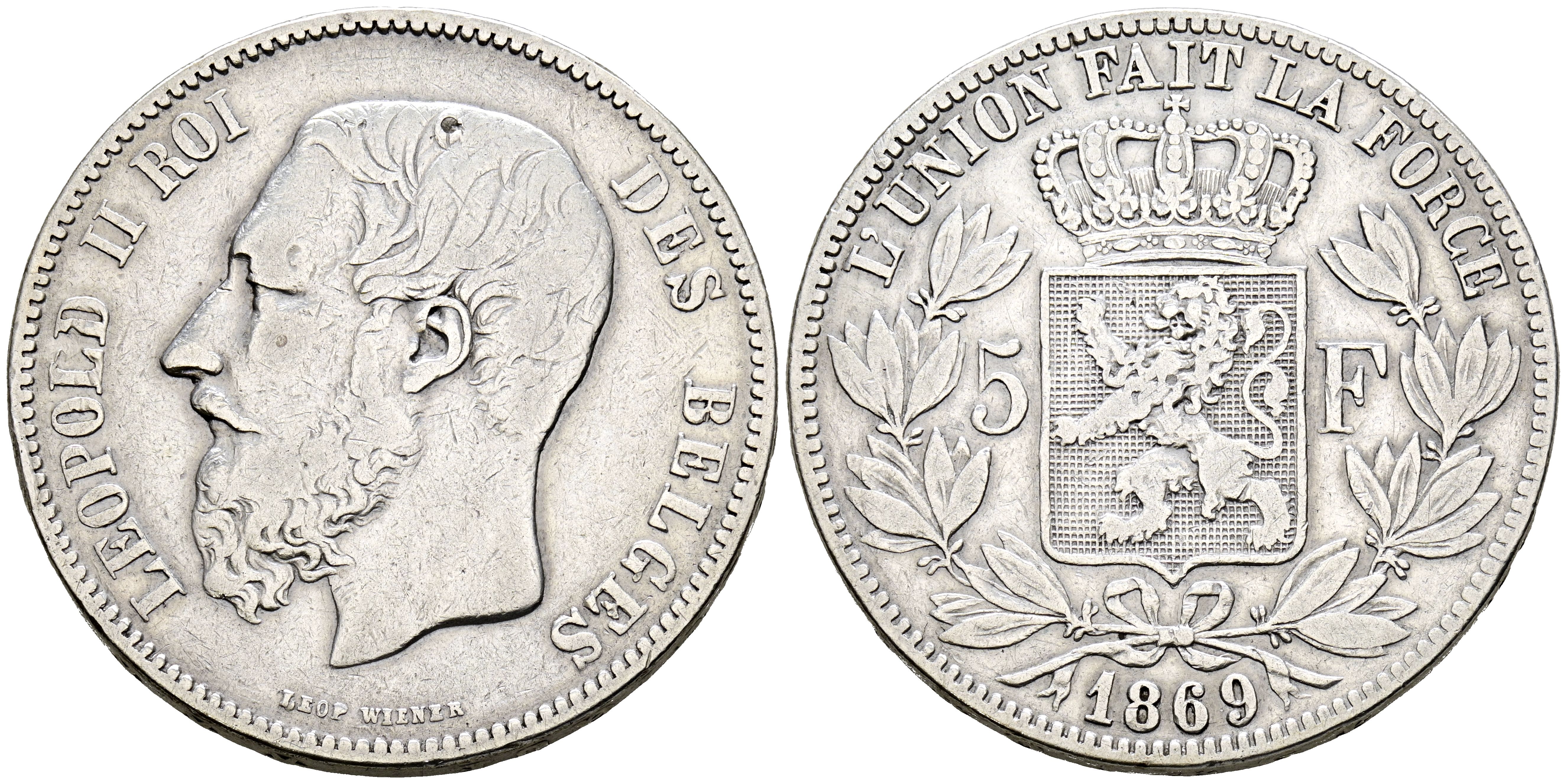 BELGIUM. 5 Francs. (Ar. 24.70g/38mm). 1869. Leopold II. (Km#24). Very Fine-/Very Fine.