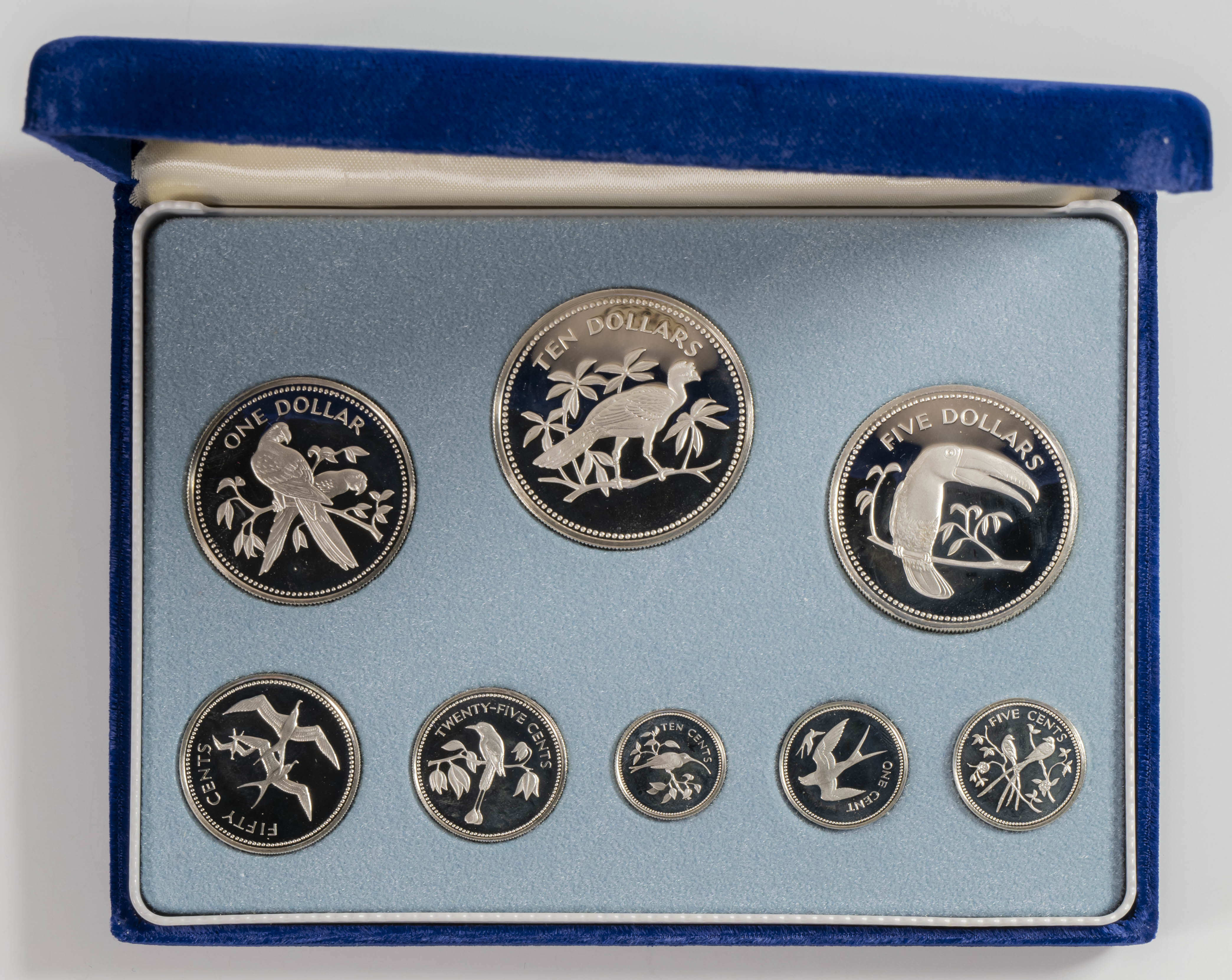 BELIZE. Original case containing 8 silver coins with values between 1 Cent and 10 Dollars. 1974. Franklin Mint. Complete Bird Series. PROOF. Certificate of authenticity not included.
