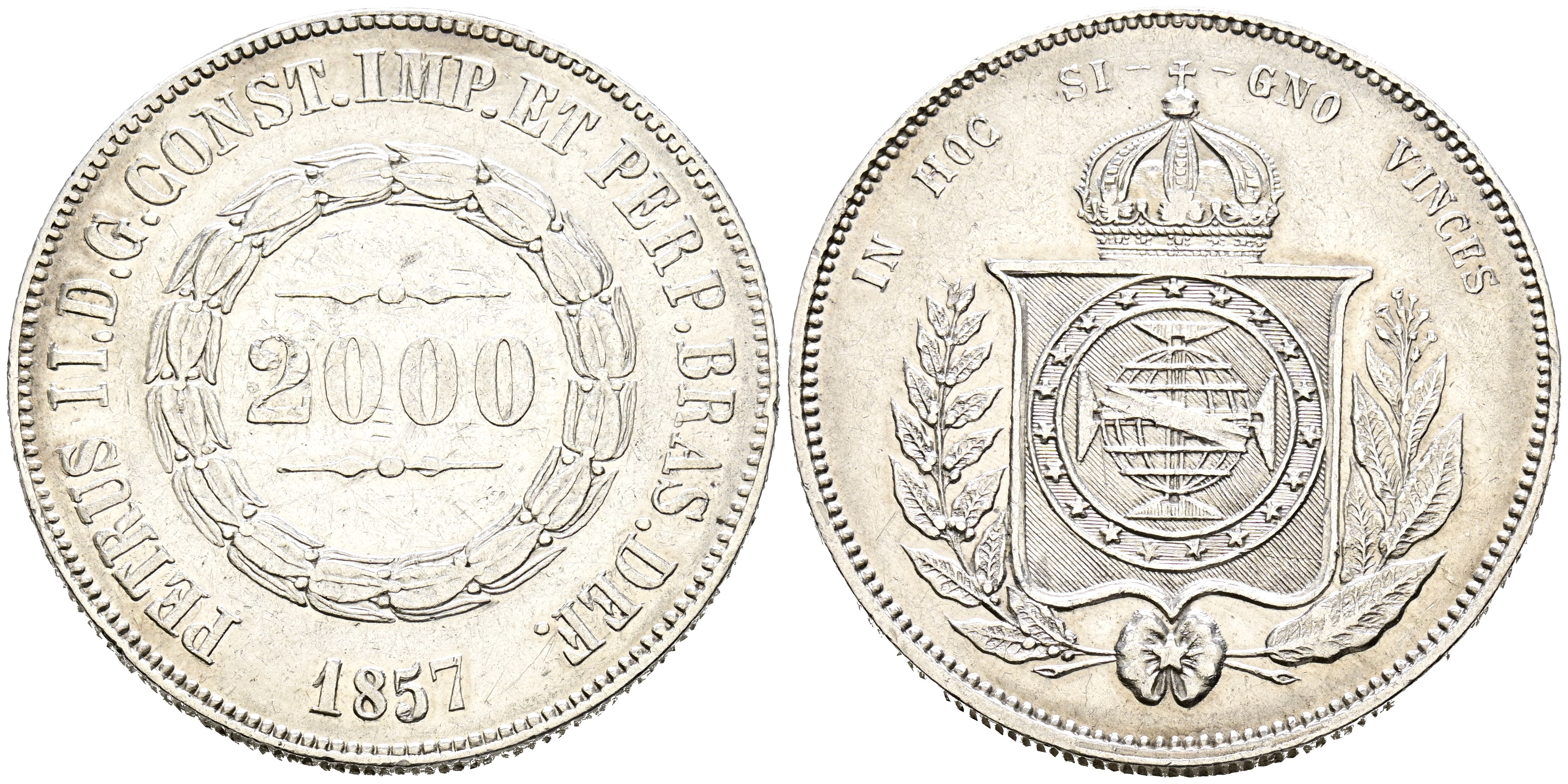 BRAZIL. 2000 Reis (Ar. 25.36g/37mm). 1857. Peter II. (Km#466). Good Very Fine. Marks.