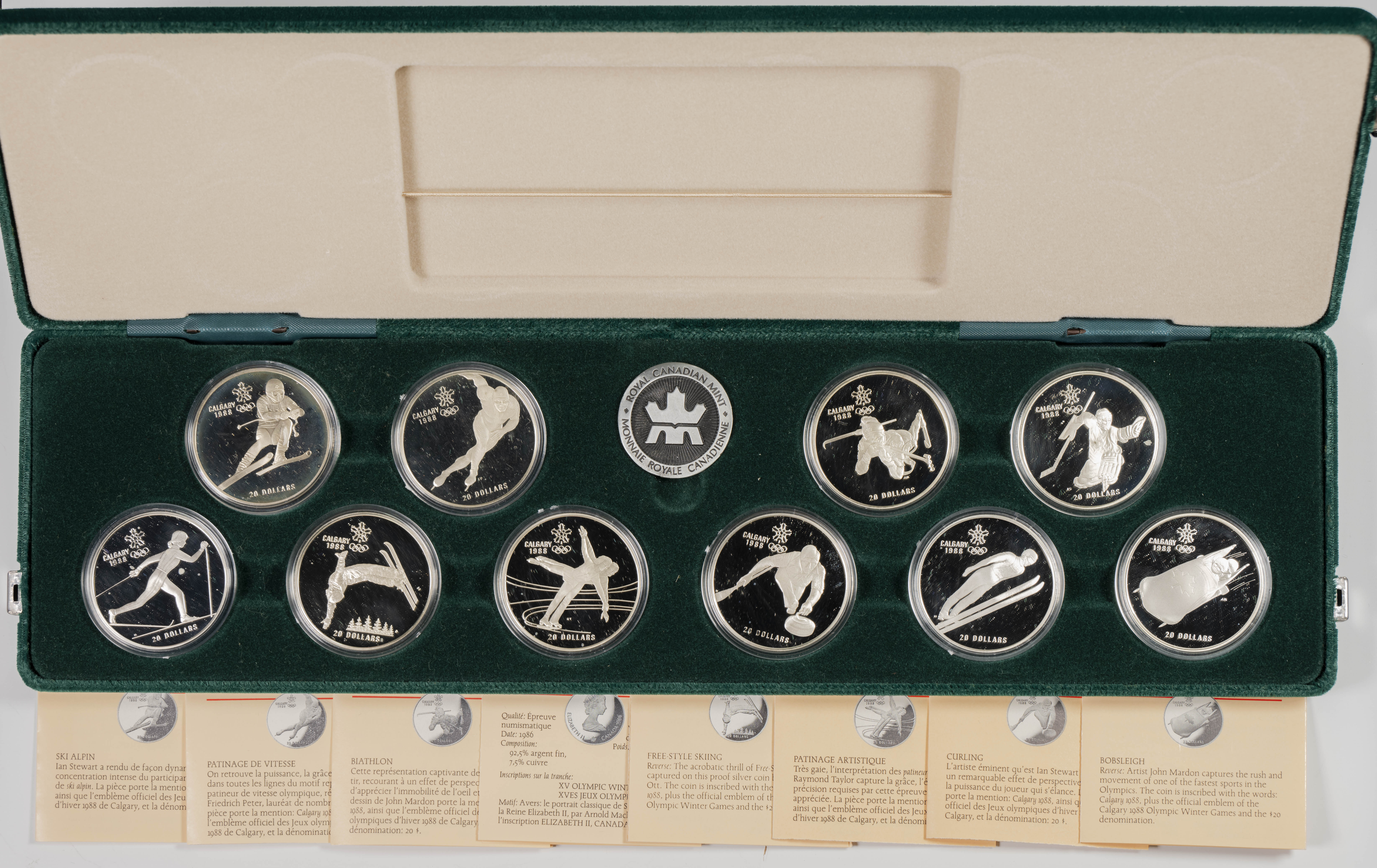 CANADA. Complete and official case containing 10 silver coins of 20 Dollars. Calgary Winter Games. 1988. PROOF. Includes certificates of authenticity and capsules.