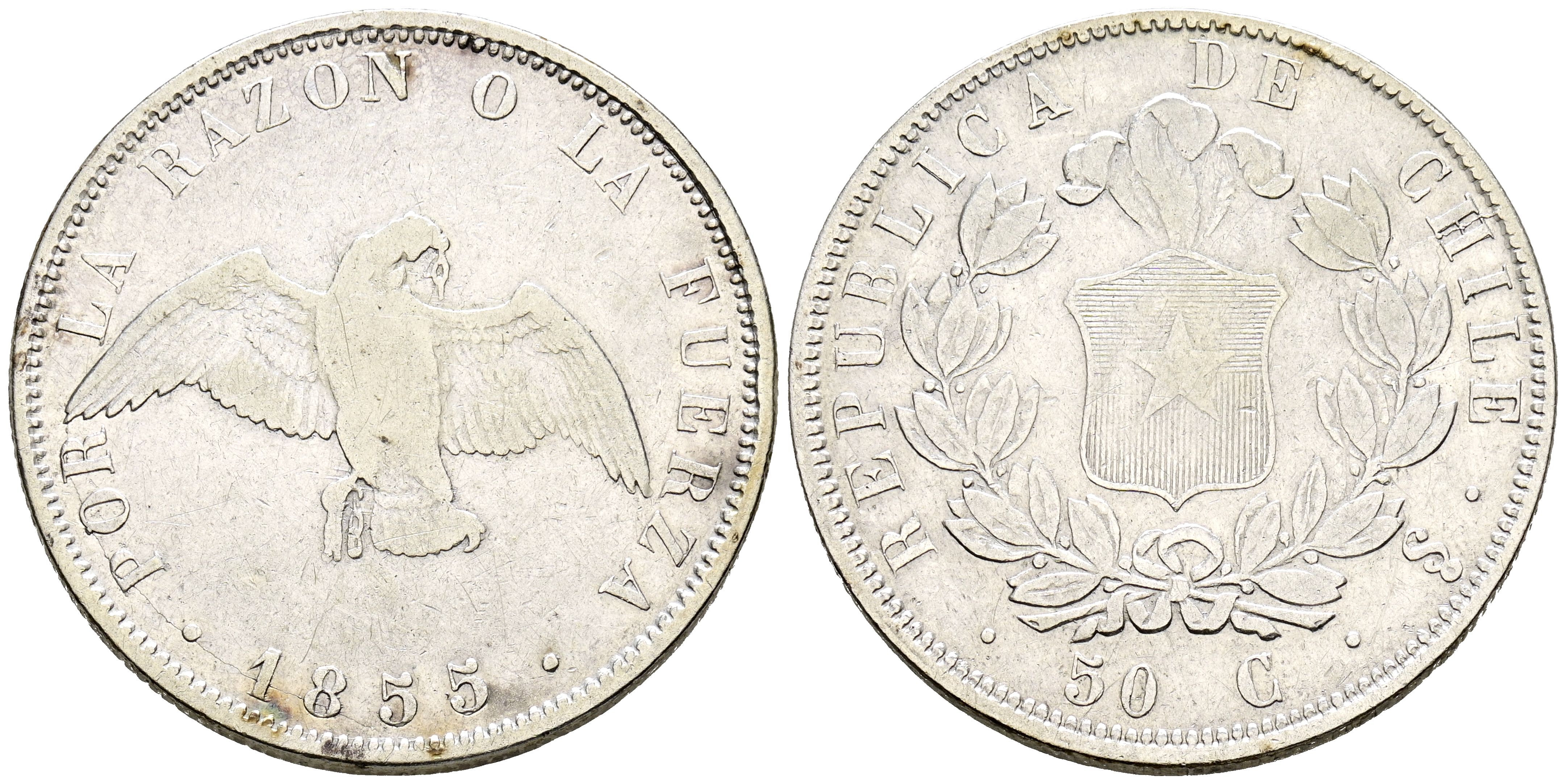 CHILI. 50 Cents (Ar. 11.96g/31mm). 1855. Santiago. (Km#128). Very Fine-