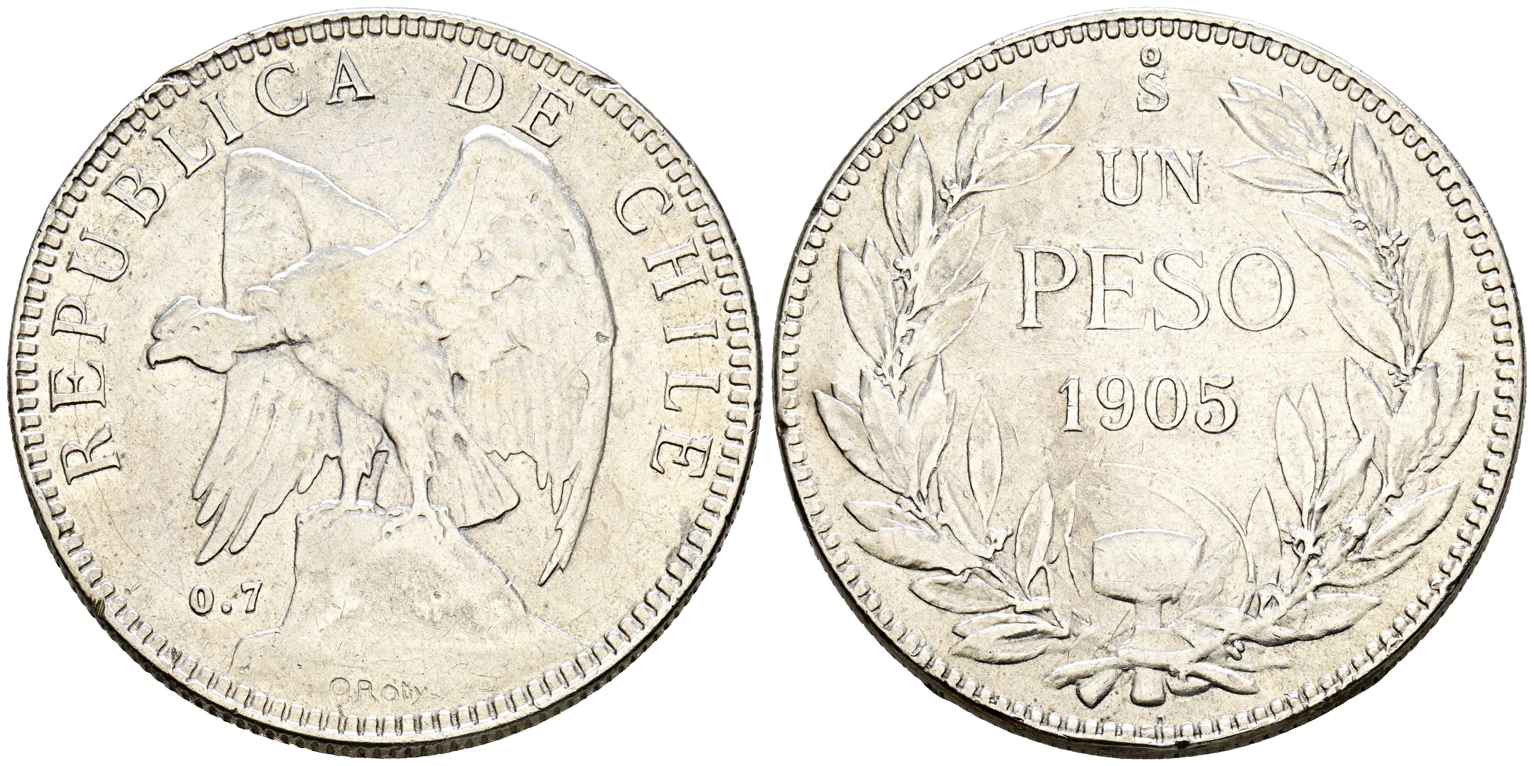 CHILI. 1 Weight (Ar. 19.91g/35mm). 1905. Santiago S. (Km#152.2). Very Fine.