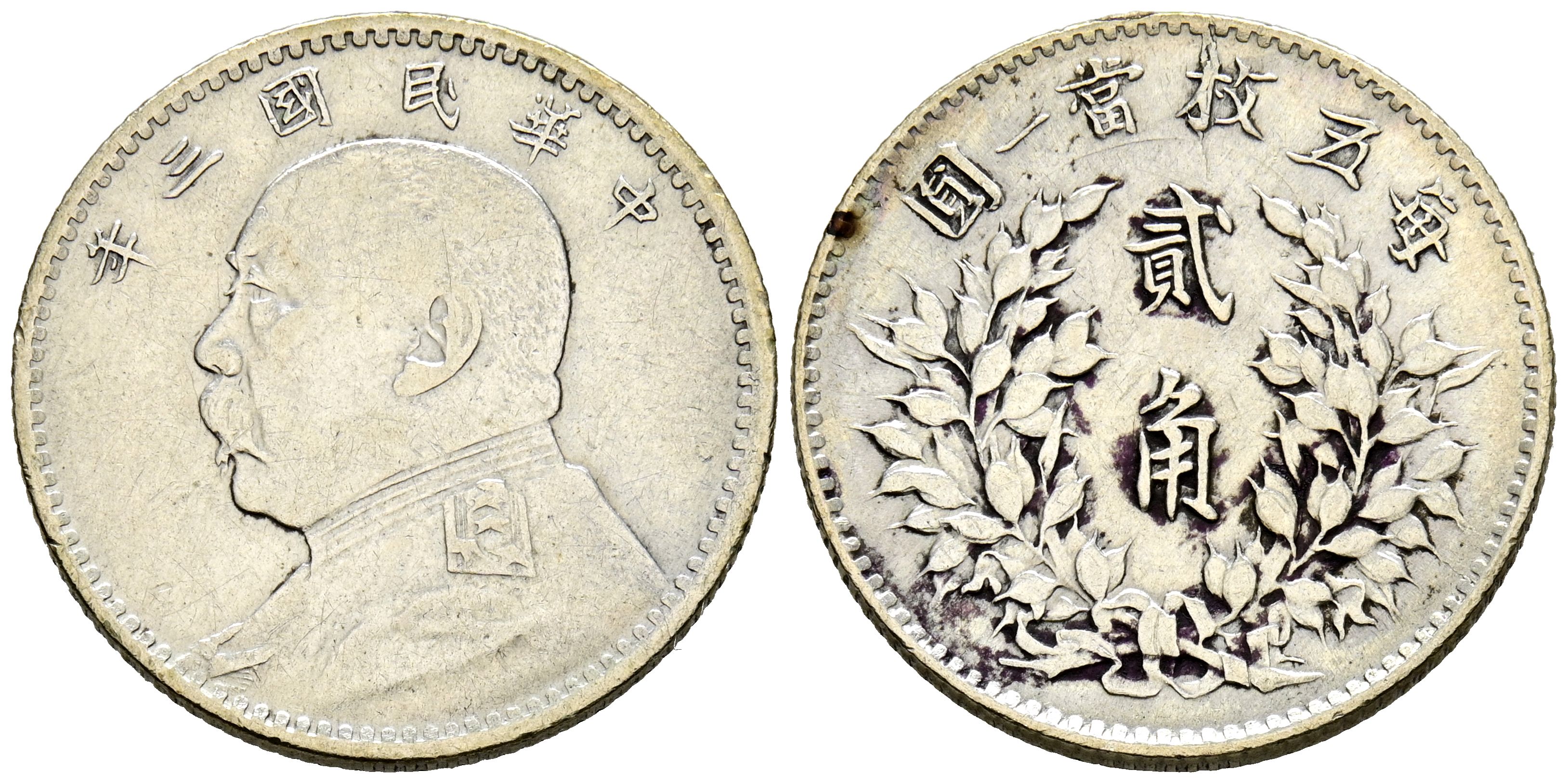 CHINA. 20 Cents (Ar. 5.43g/23mm). 1914 (Year 3). Bust of Yuan Shi Kai on obverse. (Km#327). Good Very Fine.