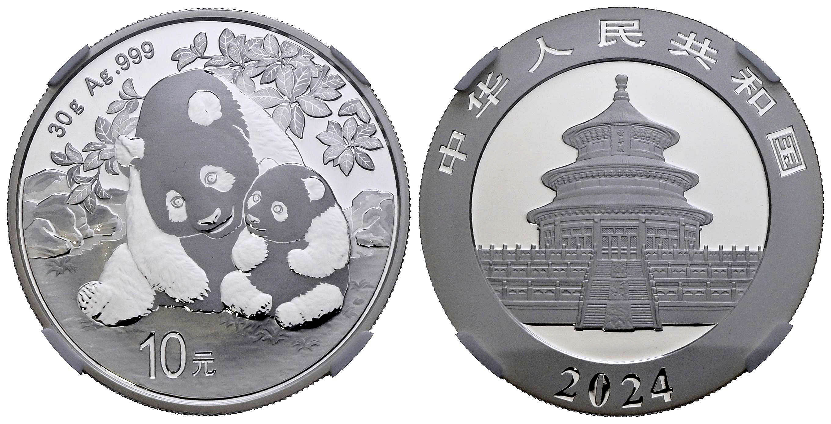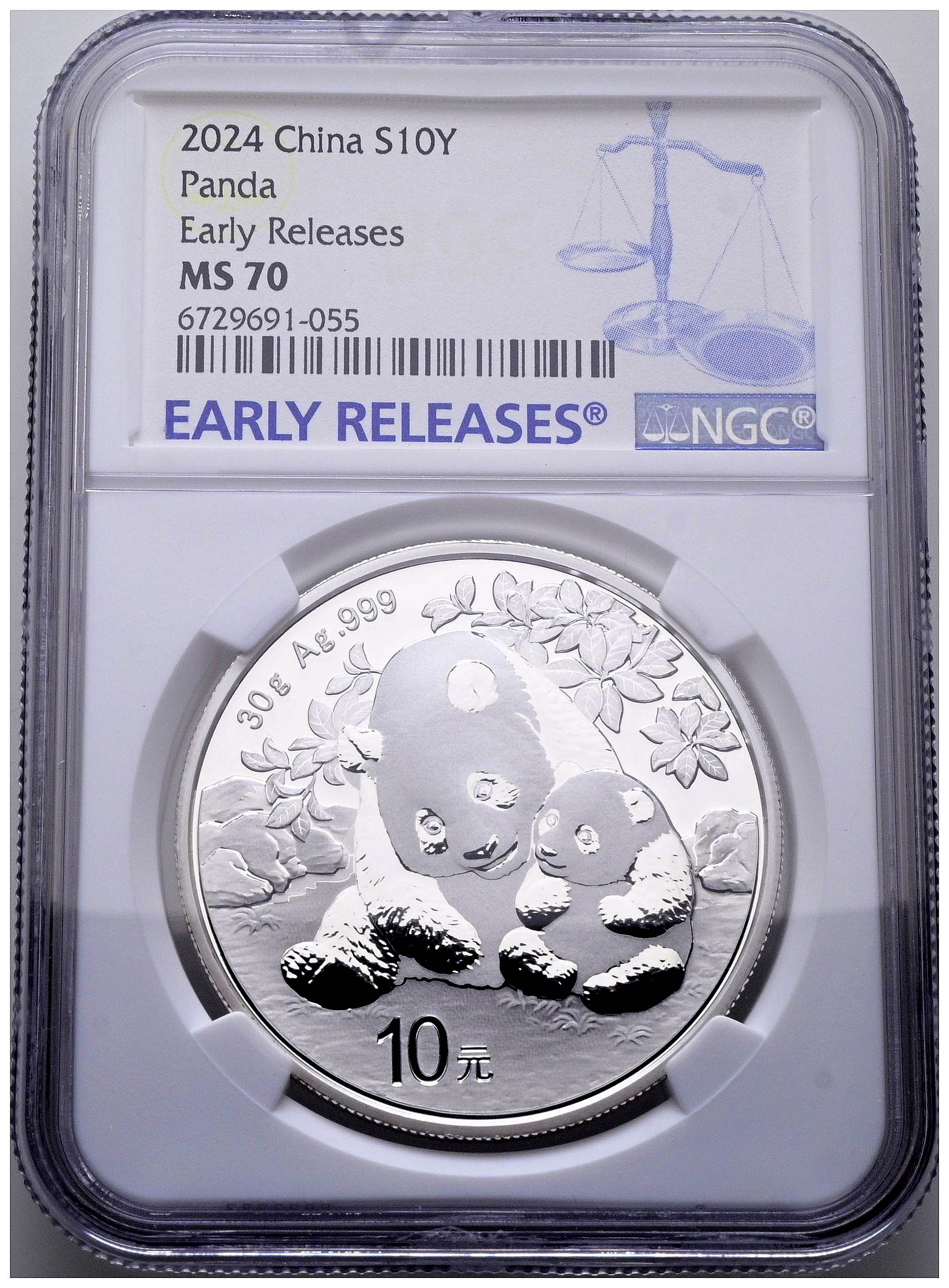 English CHINA. 10 Yuan. (Ar. 30.00g/40mm)*. 2024. Panda Series. Encapsulated by NGC MS 70, Early Releases. *Theoretical weight and measurements.