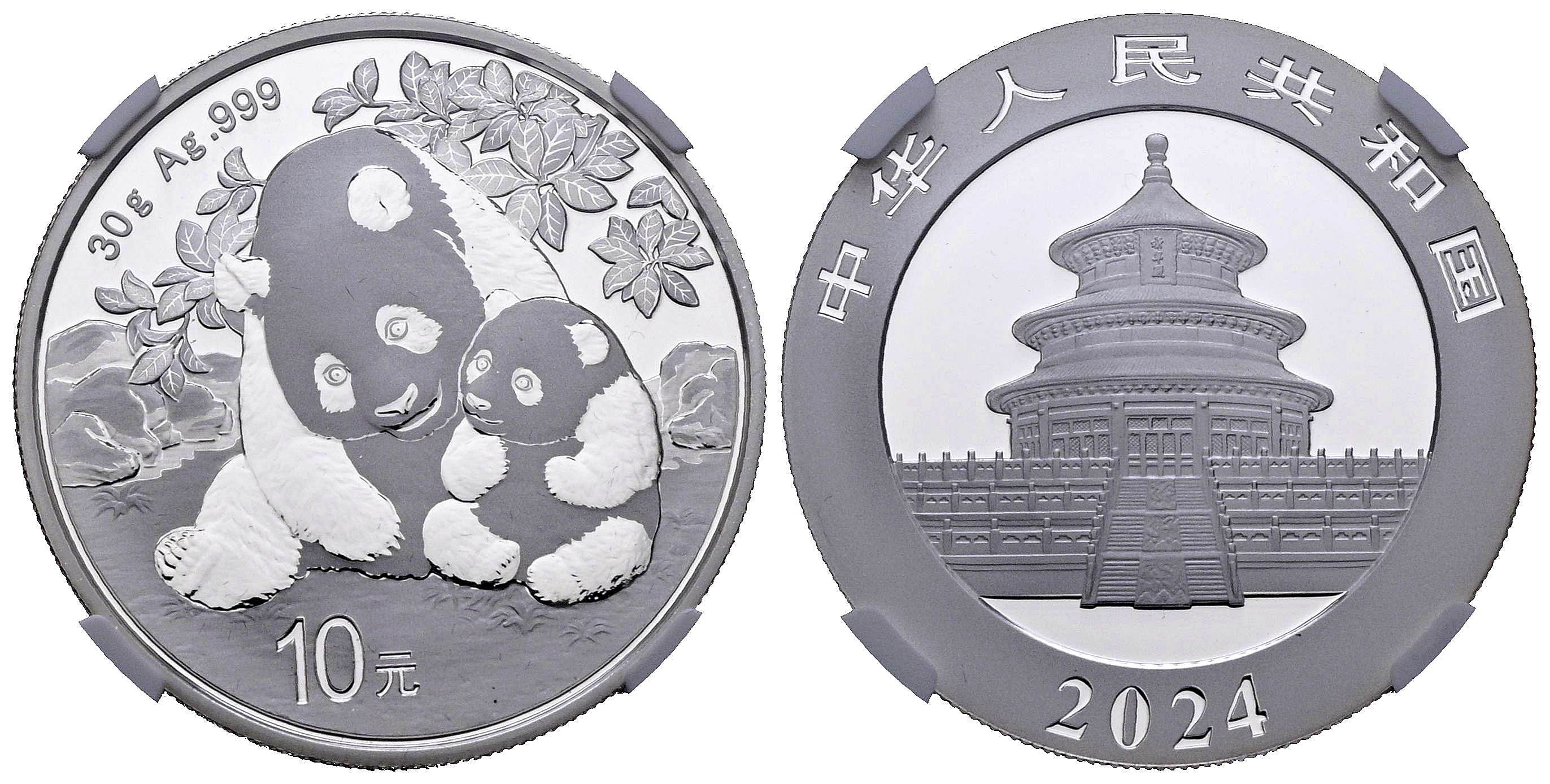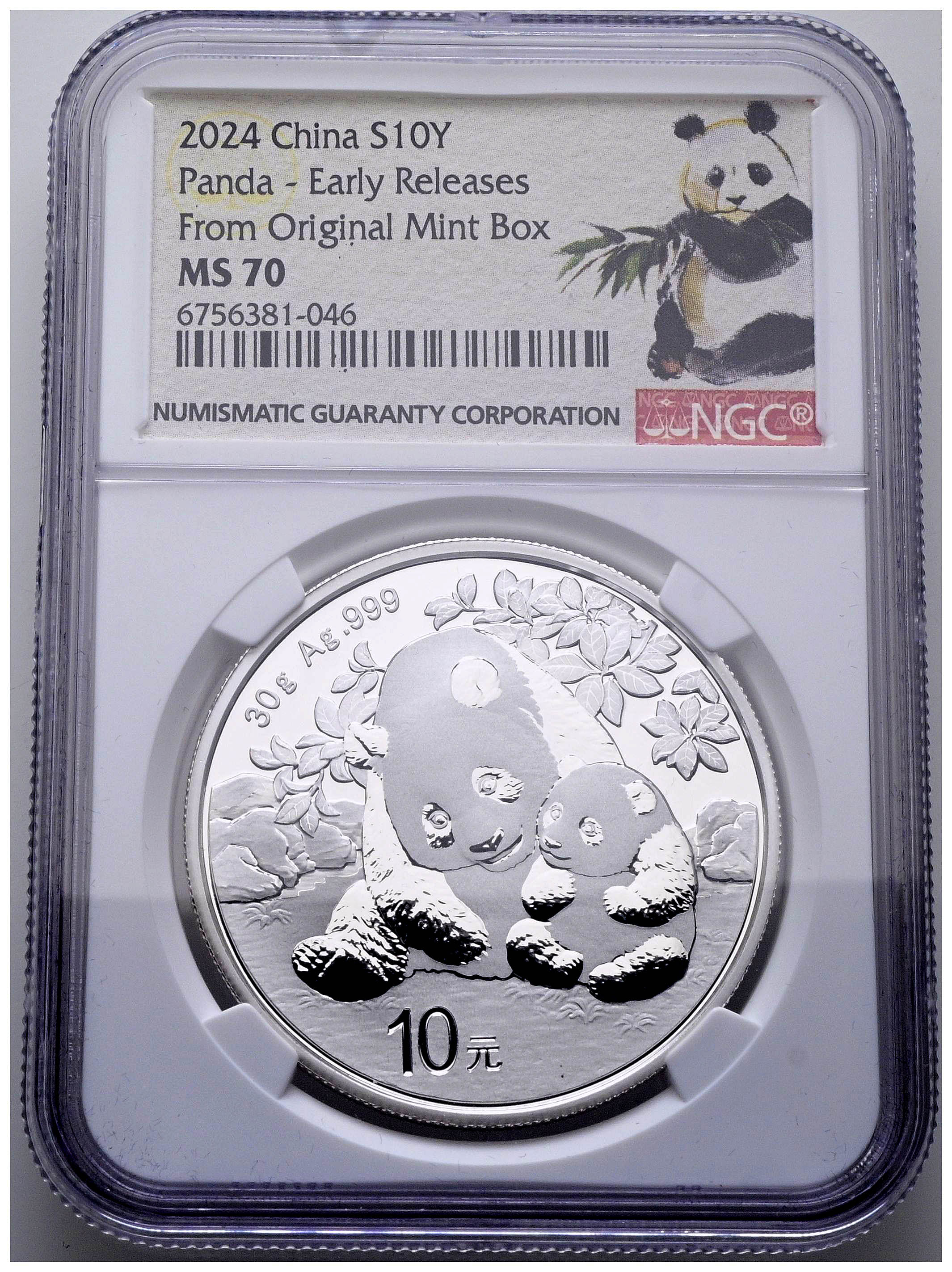 English CHINA. 10 Yuan. (Ar. 30.00g/40mm)*. 2024. Panda Series. Encapsulated by NGC MS 70, Early Releases. From original Mint Box. *Theoretical weight and measurements.