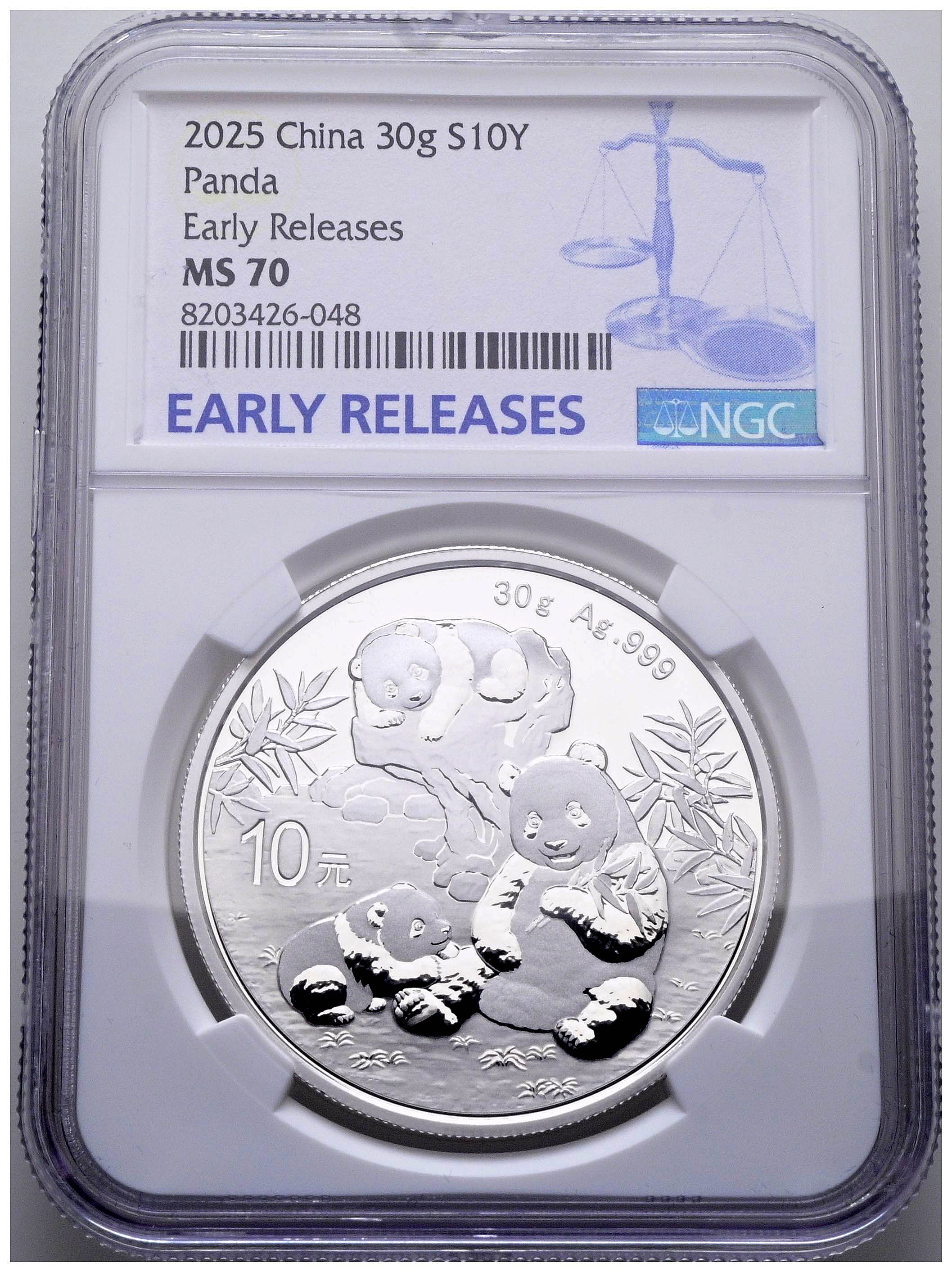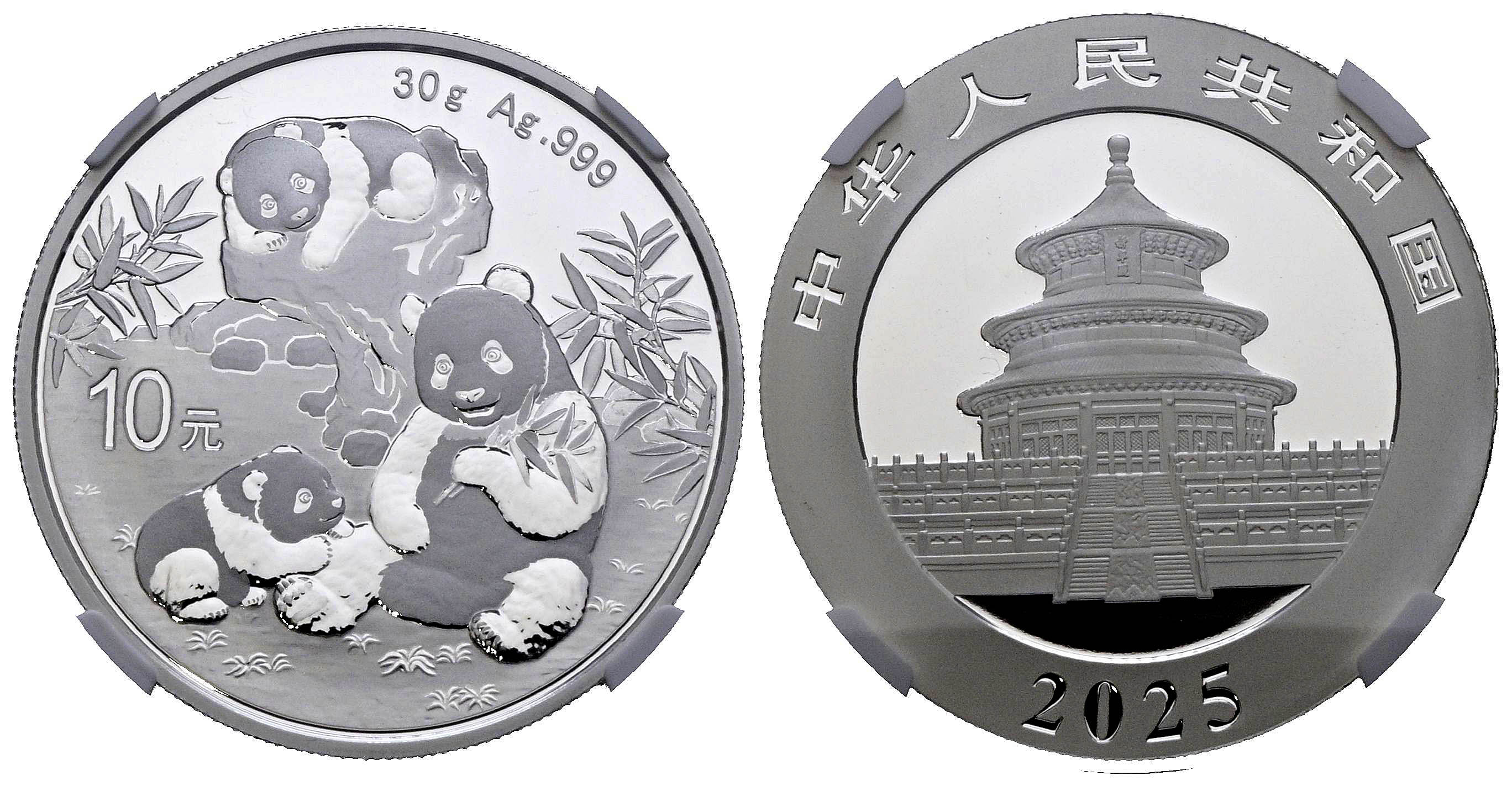 English CHINA. 10 Yuan. (Ar. 30.00g/40mm)*. 2025. Panda Series. Encapsulated by NGC MS 70, Early Releases. *Theoretical weight and measurements.