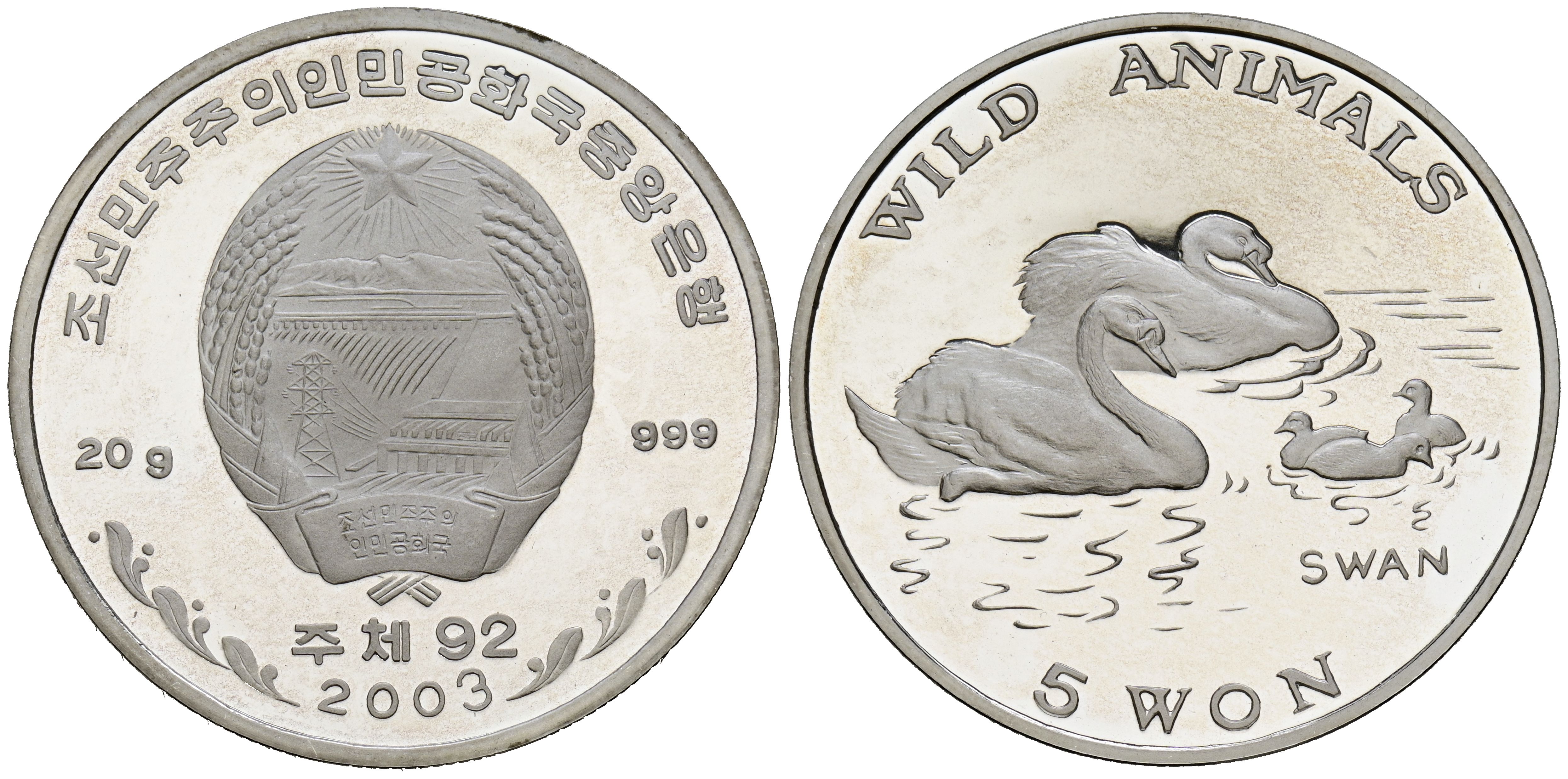 NORTH KOREA. 5 Won. (Ar. 19.97g/35mm). 2003. Wildlife: Swan (Km#900). PROOF. Rare. Estimated mintage: 1000 pieces.