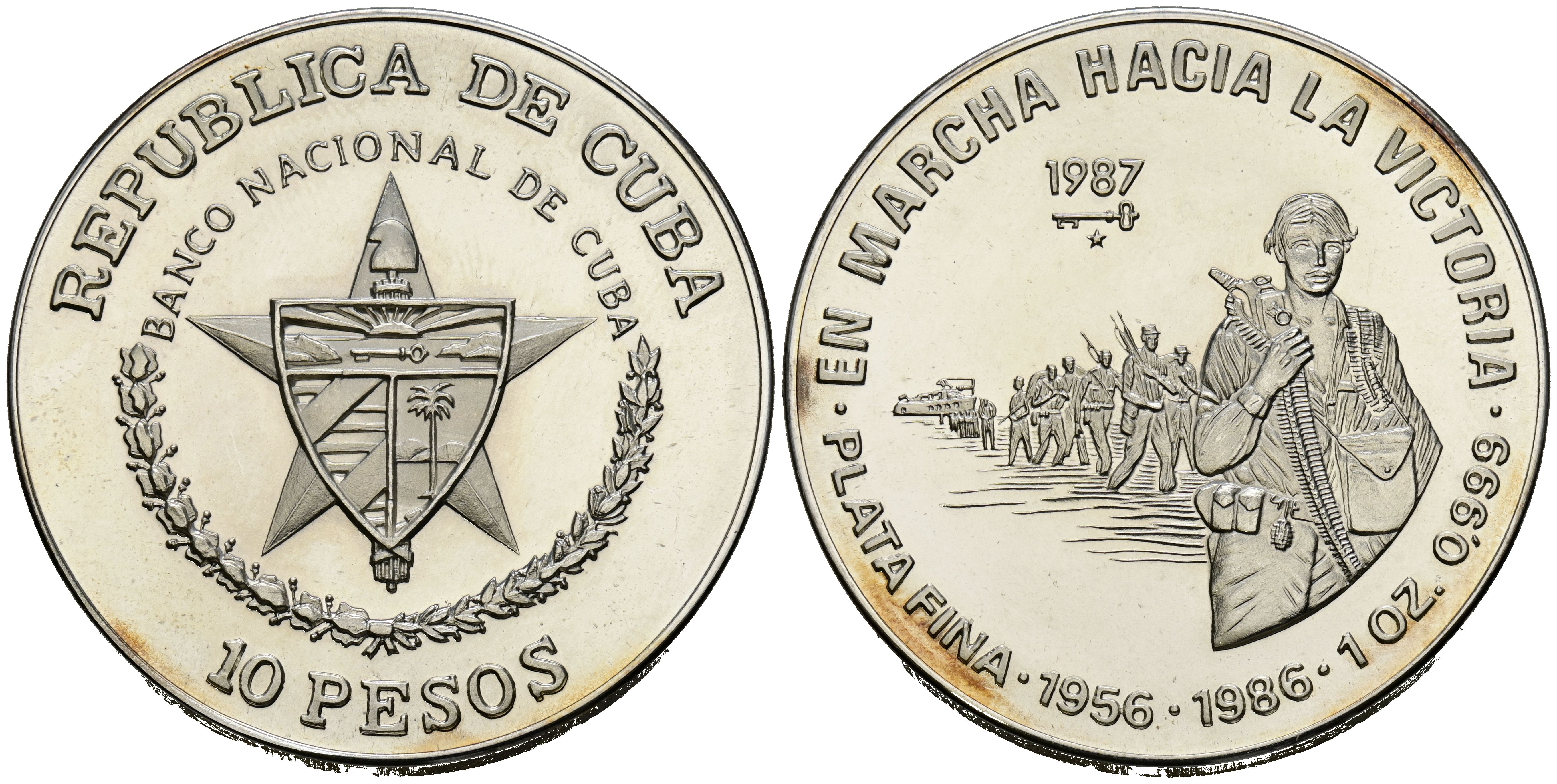 CUBA. 10 Pesos (Ar. 31.09g/38mm). 1987. On the march to Victory. (Km#164). PROOF. Only 2000 copies issued.