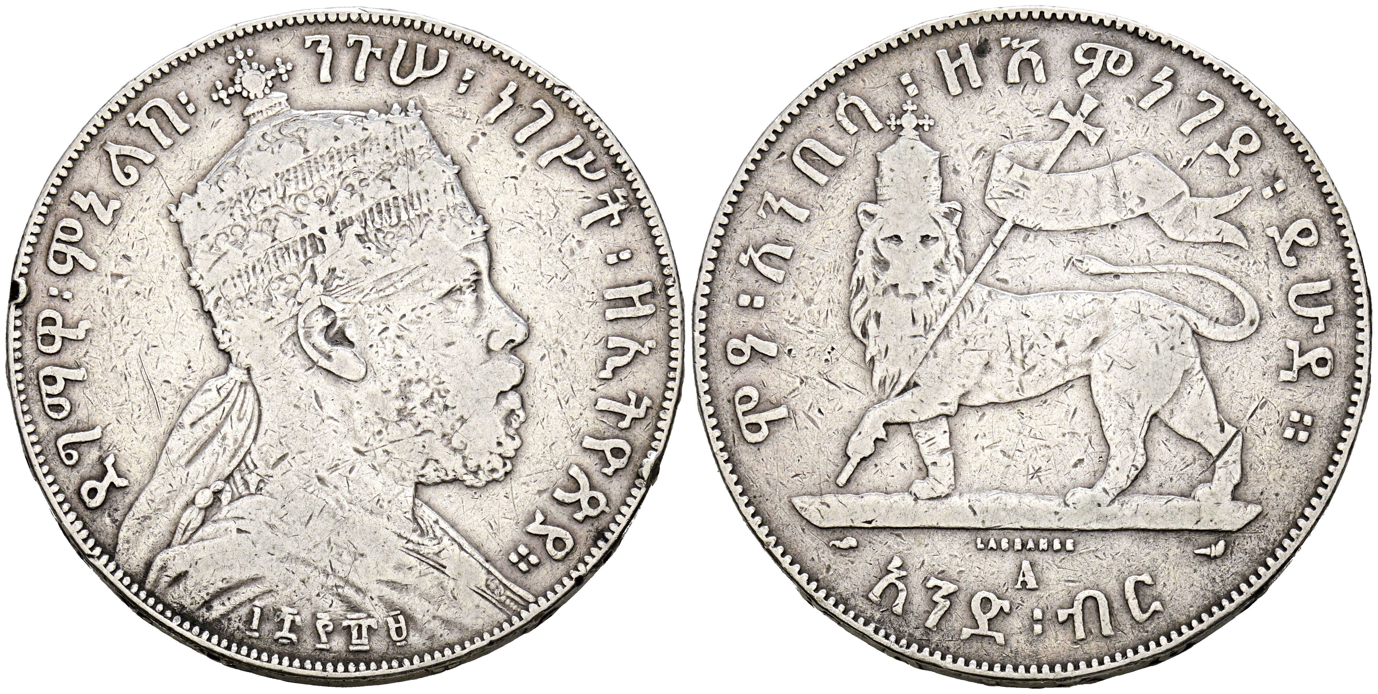 ETHIOPIA, 1 Birr. (Ar. 28.05g/40mm). 1889. Menelik II. Paris A. (Km#5). Good Fine. Scarce.