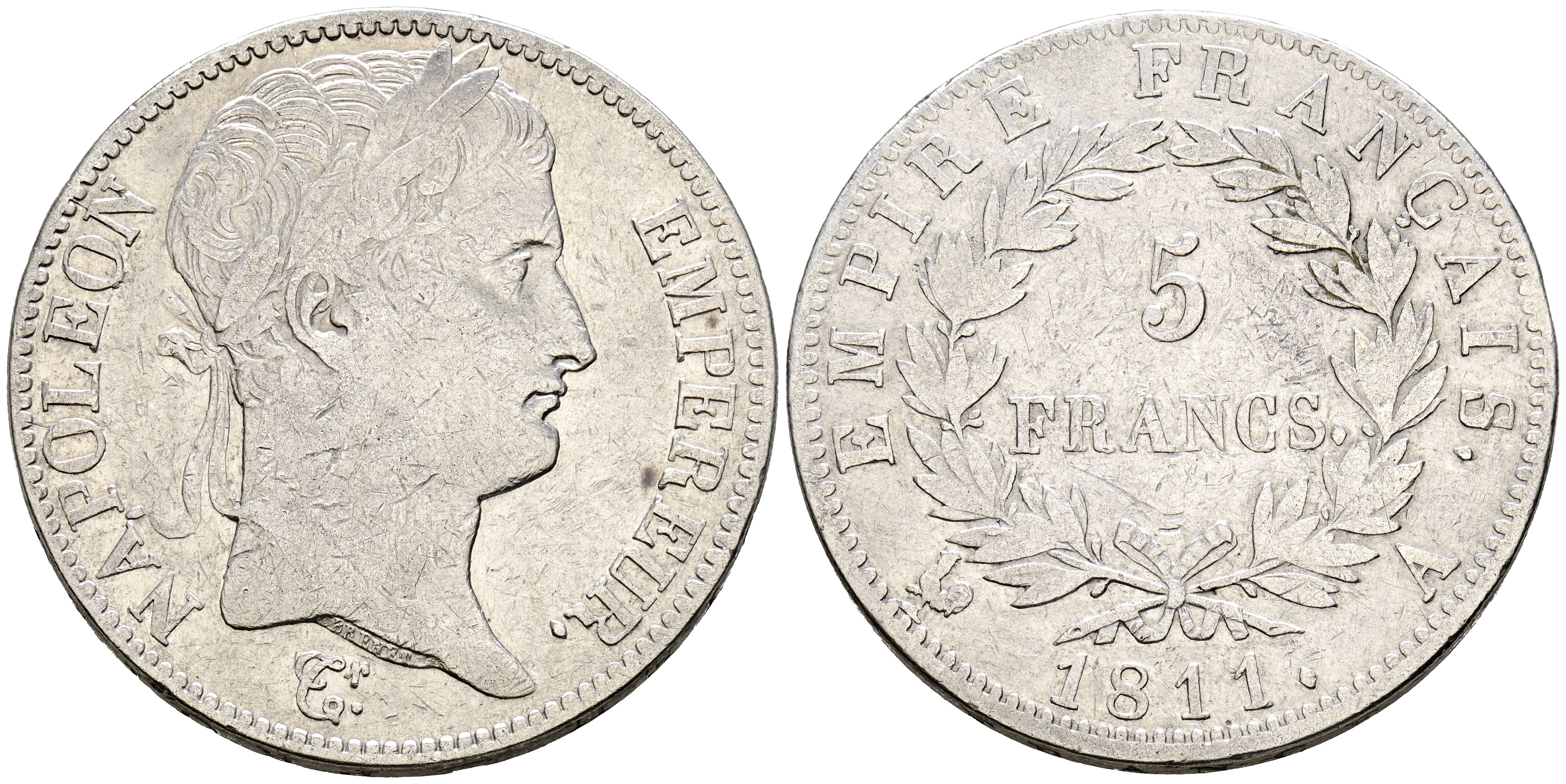 FRANCE. 5 French. (Ar. 24.81g/37mm). 1811. Napoleon. French Empire. Paris A. (Km#694.1). Very Fine-.