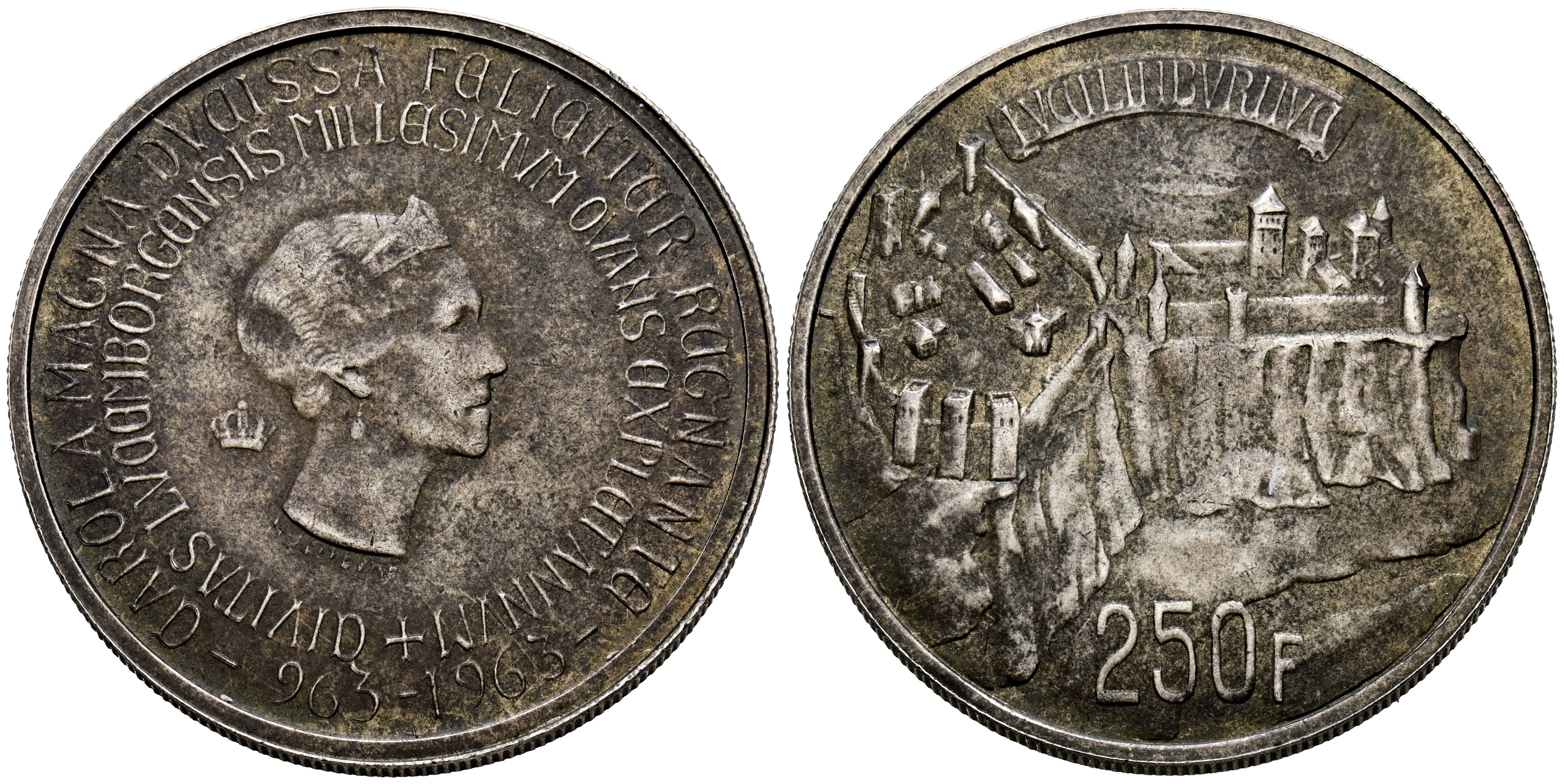 LUXEMBOURG. 250 Francs. (Ar. 25,10g/38mm). 1963. 1000th Anniversary of the City of Luxembourg. (Km#53). VF. Dark silver.