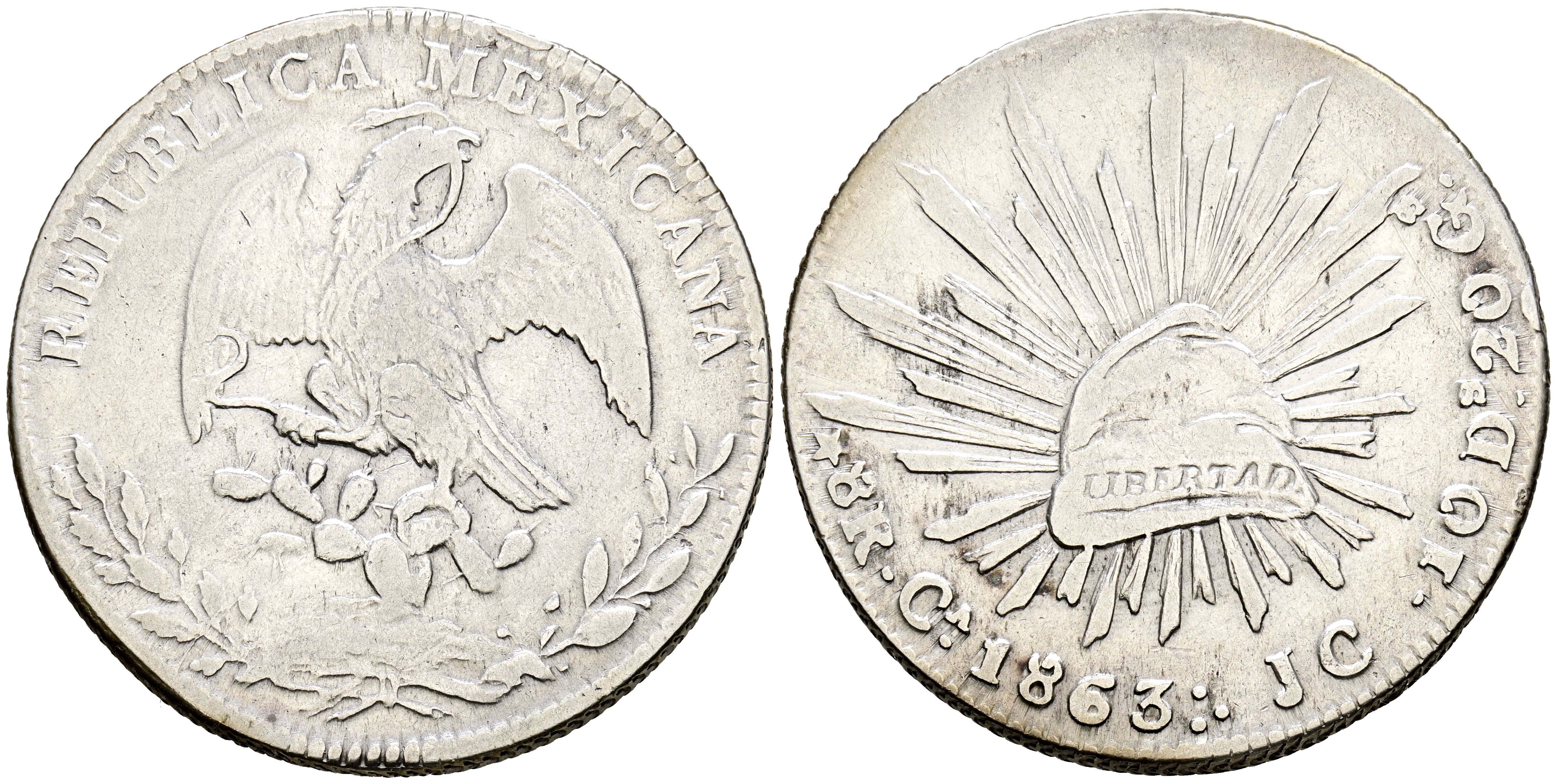 MEXICO. 8 Reales. (Ar. 26.41g/38mm). 1863. Chihuahua JC. (Km#377.2). VF-.