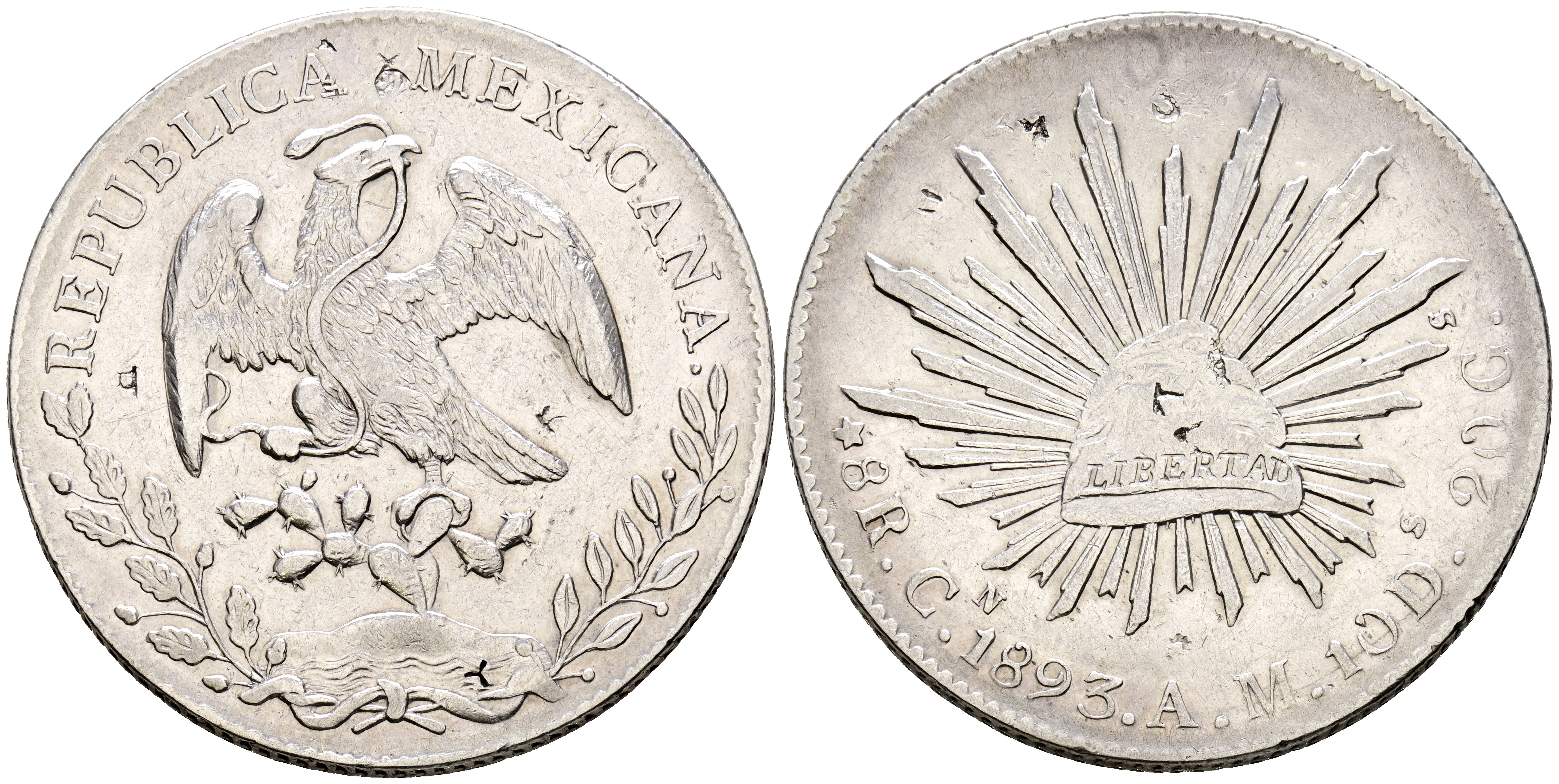 MEXICO. 8 Reales. (Ar. 27.03g/39mm). 1893. Culiacan AM. (Km#377.3). VF. Small countermarks.