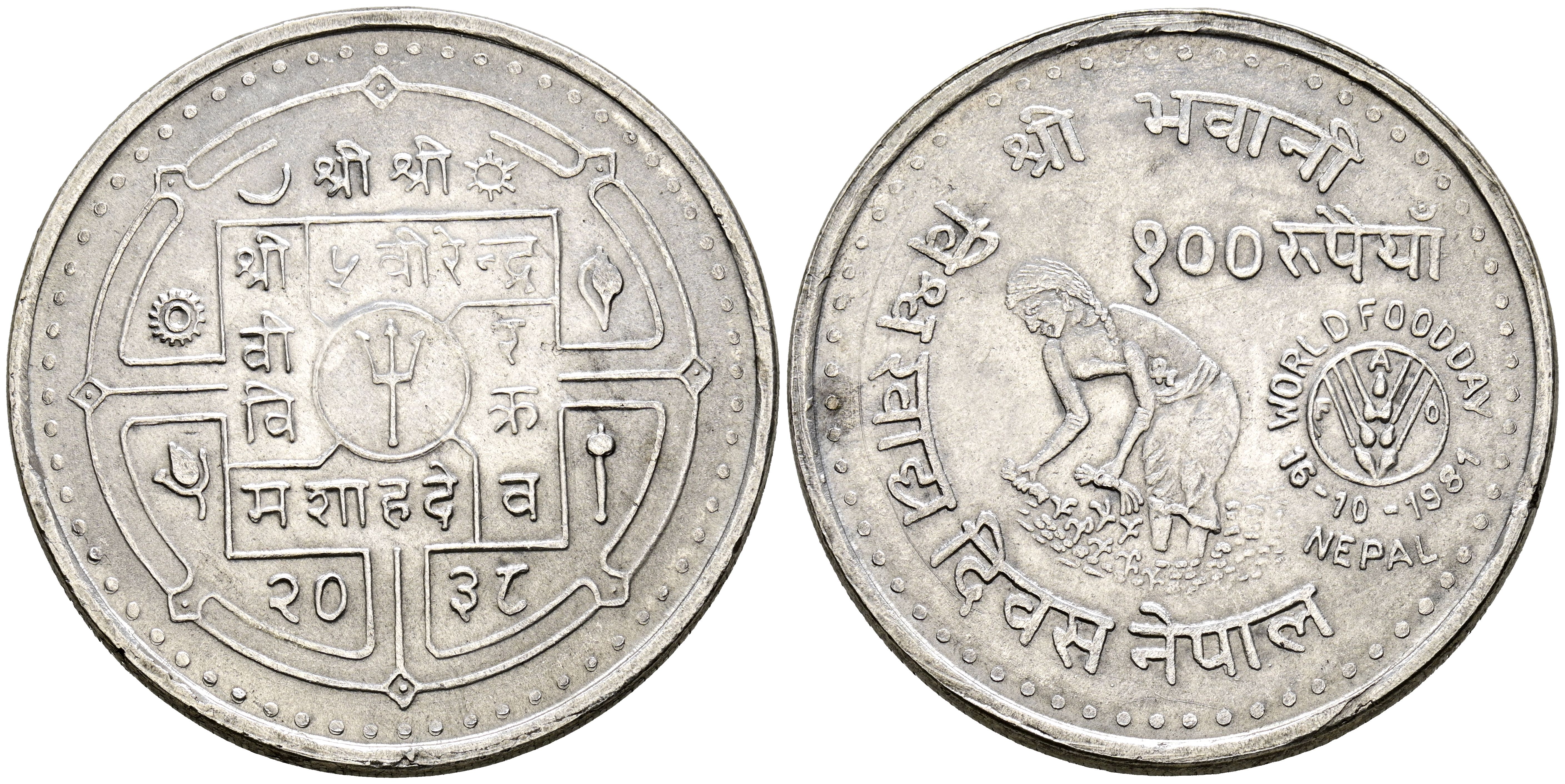English NEPAL. 100 Rupees (Ar. 25.15g/40mm). 1981. FAO. World Food Day. (Km#850.1). Good Very Fine.