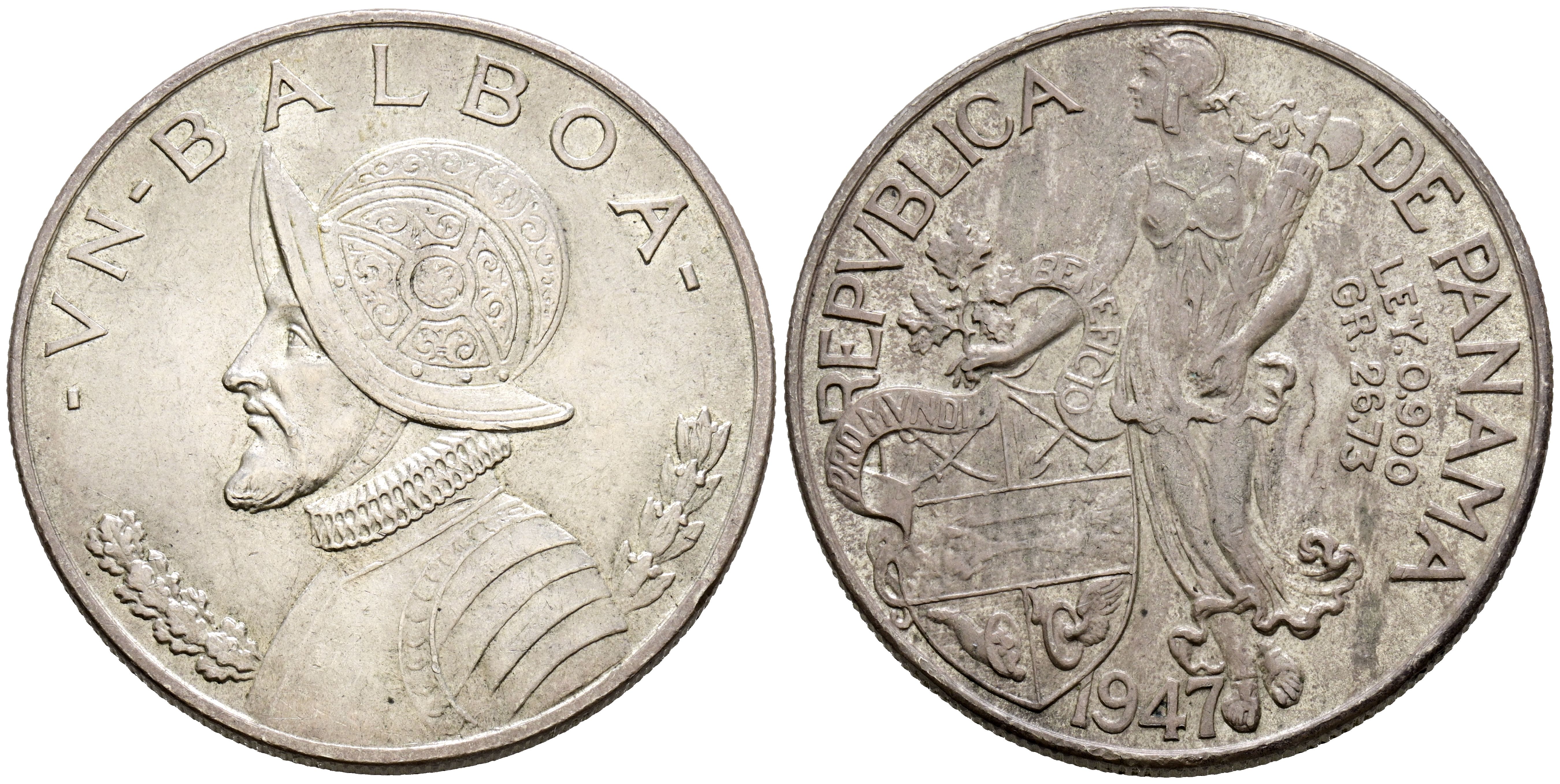 English PANAMA. 1 Balboa. (Ar. 26.68g/38mm). 1947. (Km#13). Extremely Fine-. Beautiful patina, especially on the reverse.