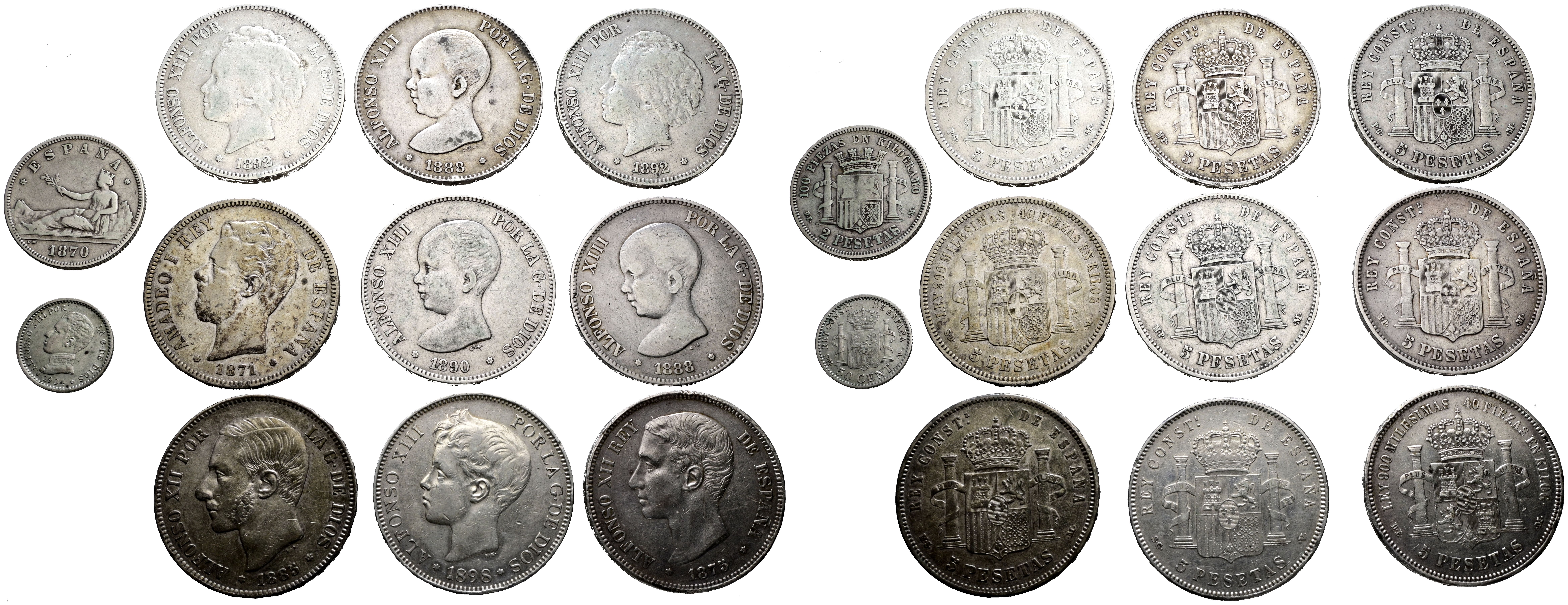 CENTENARY OF THE PESETA. Set of 11 silver coins, 9 of them with a 5 Peseta denomination. Variety of dates and types. Different states of preservation. TO BE EXAMINED.
