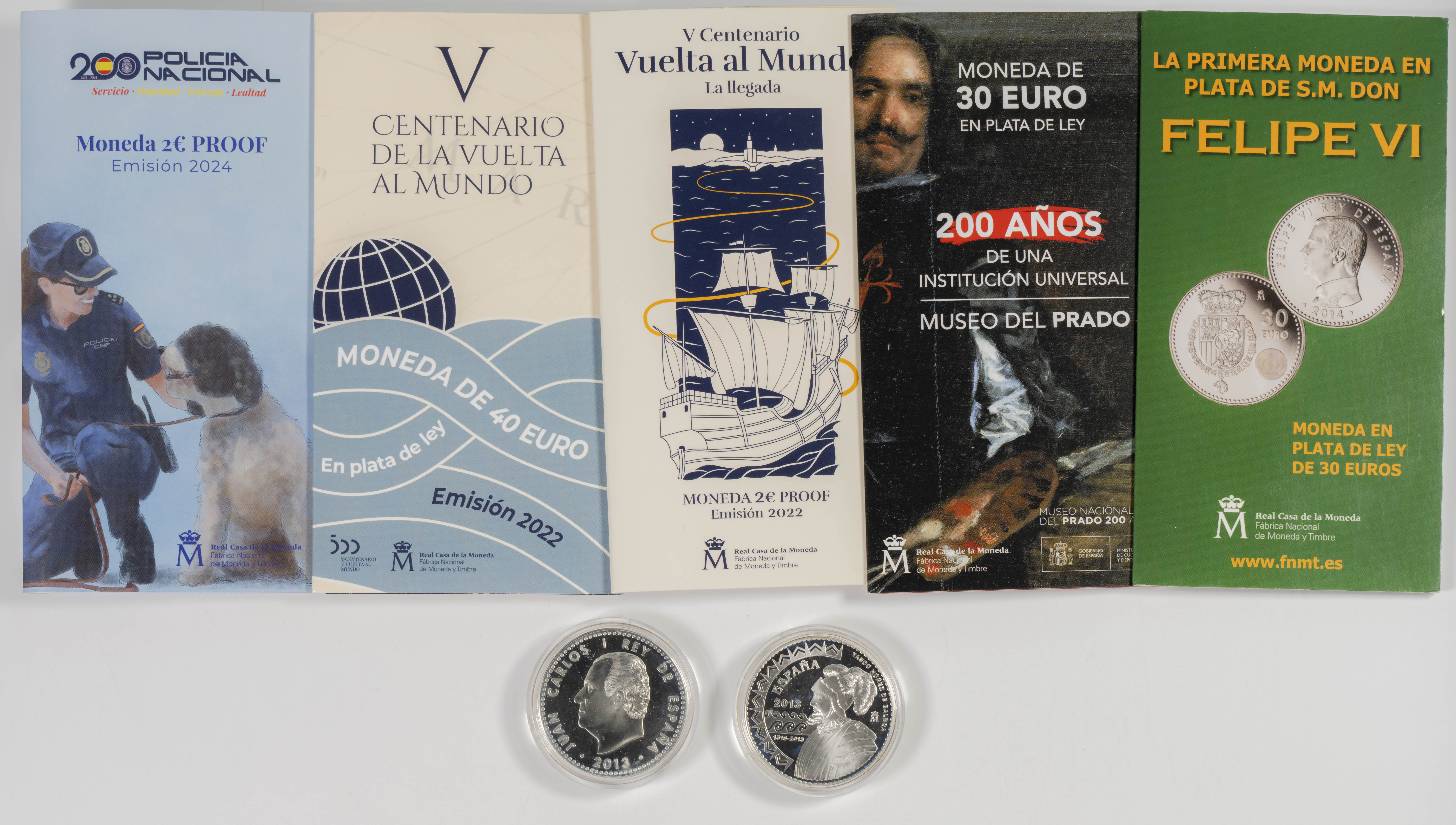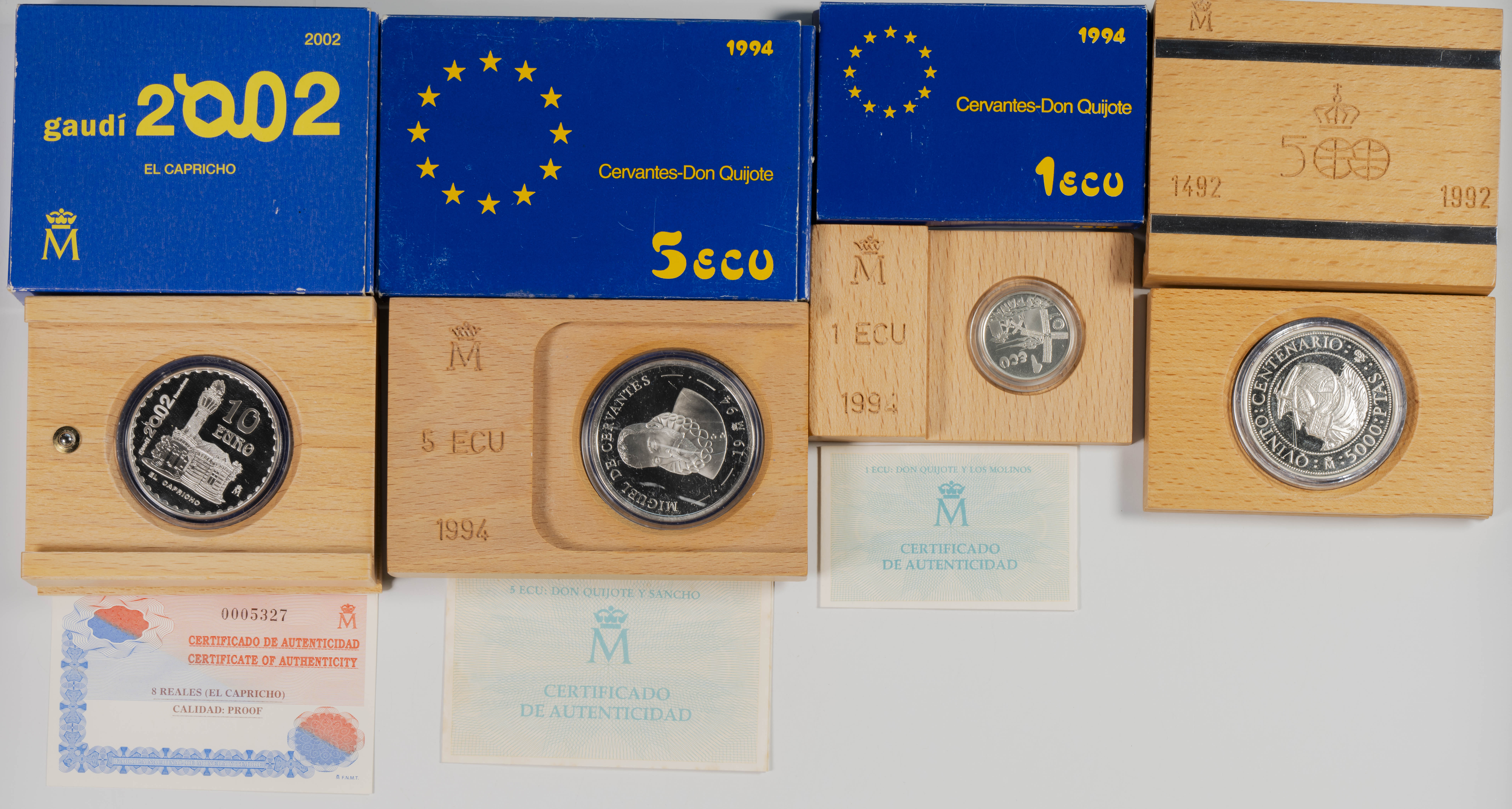 English Extraordinary set of 11 commemorative coins, mainly in silver, with values in Pesetas, Ecus and Euros. Variety of modules and themes, including cases and blisters. PROOF and FDC finishes. TO BE EXAMINED.
