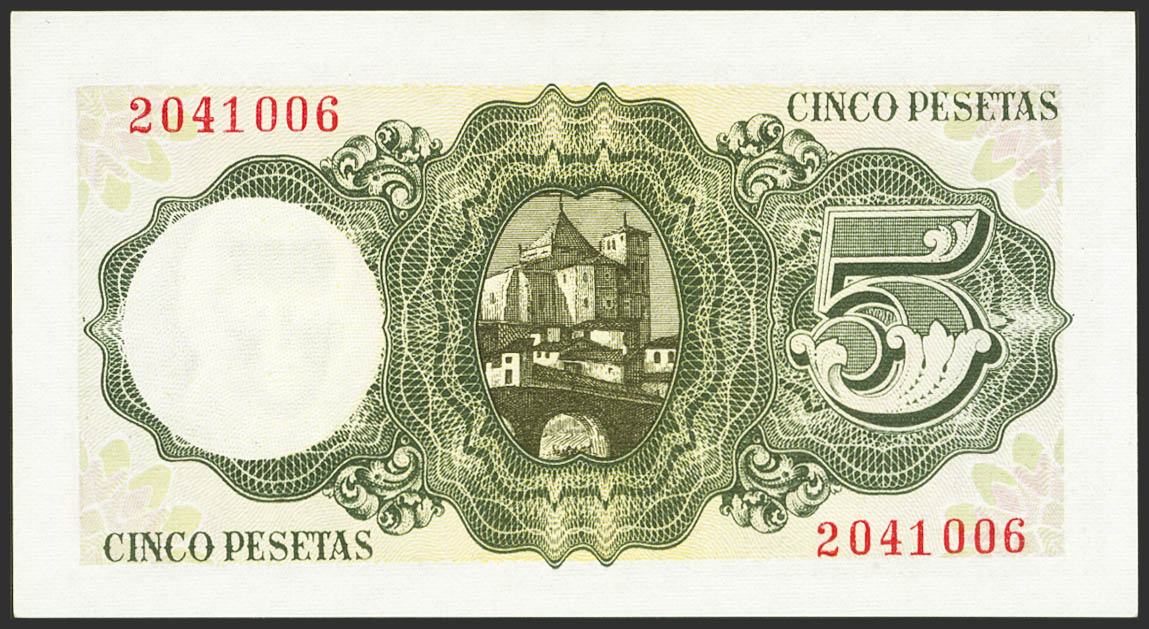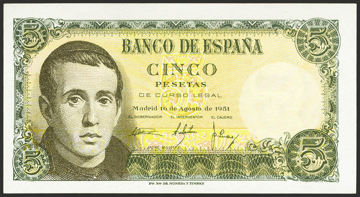 English 5 Pesetas. August 16, 1951. No series. (Edifil 2023: 459). Original size. Uncirculated-.