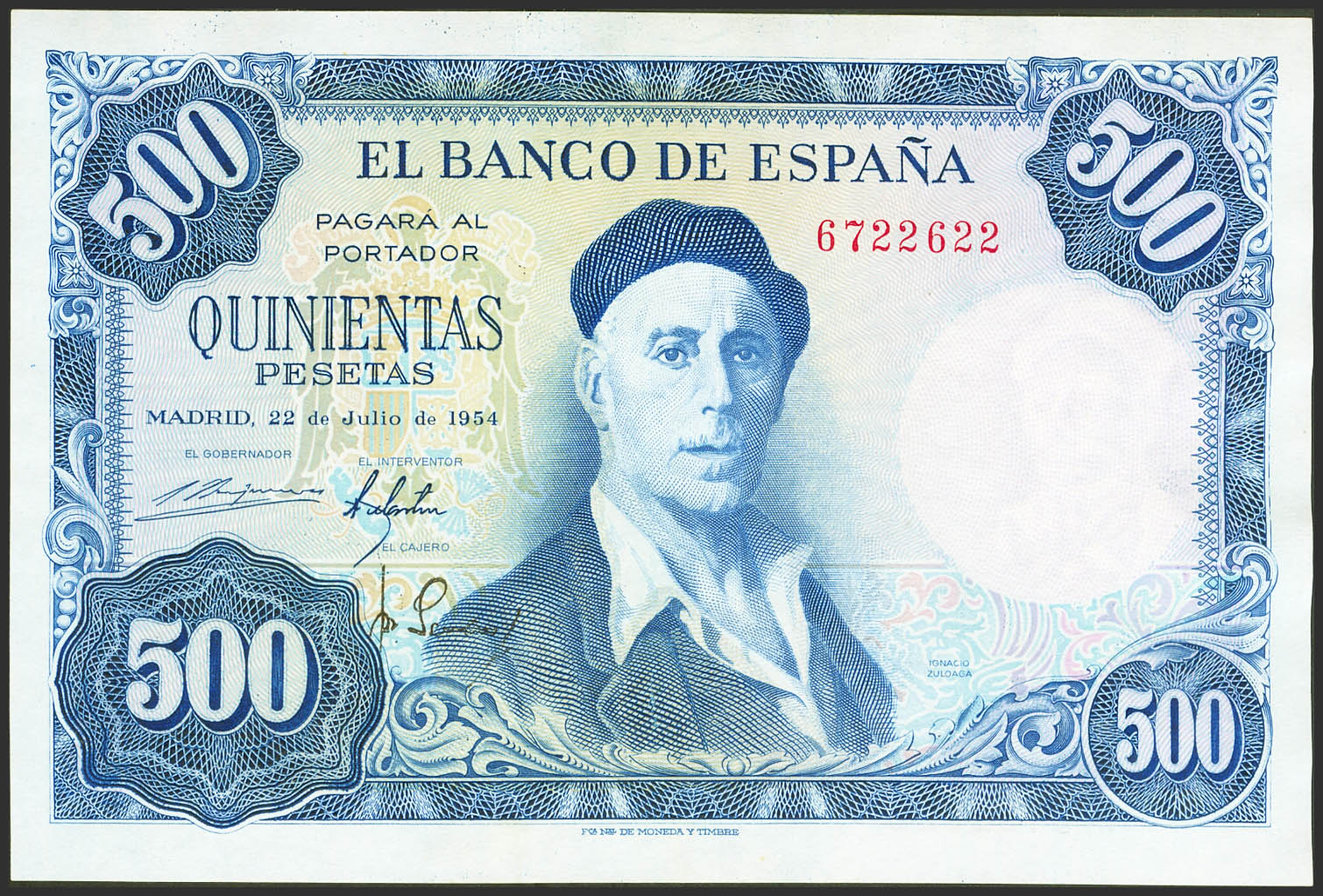 500 Pesetas. July 22, 1954. No series. (Edifil 2023 468, Pick: 148a). Retains some of its original finish. Good Extremely Fine.