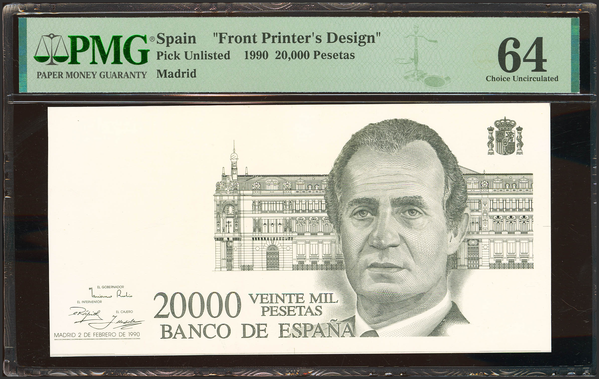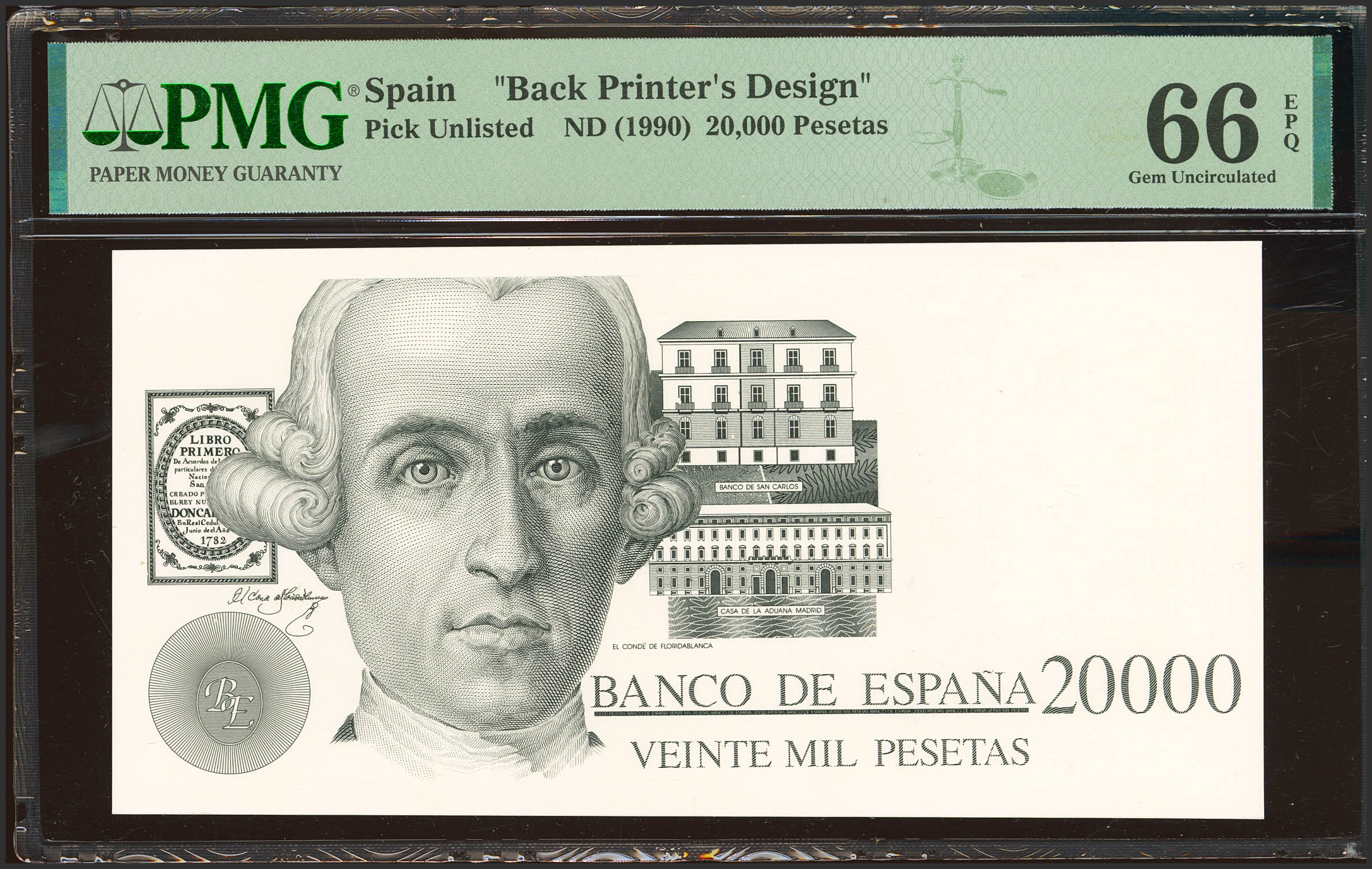 Definitive black proof of the obverse and reverse of an unissued 20,000 Pesetas "El Conde de Floridablanca" banknote. The proposed issue date of February 2, 1990, is known, although it is not printed. This was designed by José López López-Pavía. (The numerator typography is typical of FNMT projects from the 1980s and 1990s.) (Edifil 2023: NE72P, NE72Pb, Pick: Unlisted). This piece is extremely spectacular and rare, especially considering both proofs. Uncirculated. Encapsulated PMG64/66EPQ. The long banknote issue developed since the transition was the first to be conceived as a whole with a specific dimensional and color logic, in addition to featuring a groundbreaking design by José María Cruz Novillo. This 1979-1985 issue represented a definitive transgression not only of aesthetic canons (no borders, the watermark in a different place, oversized and partially cropped portraits), but also of the traditional limits of banknote denominations, in which 1,000 pesetas represented the highest denomination. During the Civil War, the Republican faction was on the verge of issuing a 5,000-peseta banknote, but it wouldn't be until the first issue of Juan Carlos I that the barrier was definitively broken and that denomination was issued. A few years later, in the midst of the inflation crisis, Spain needed higher-denomination banknotes. The 5,000-peseta banknote from 1979 became one of the most widely issued in history, but it wasn't enough. Shortly after, the FNMT embarked on the first 10,000-peseta banknote in history, dated 1985. But even so, it didn't seem enough, and in 1990, the Bank of Spain planned to put a 20,000-peseta banknote into circulation in the spring of 1991. Only a single copy of that project exists, the one shown here. The designs for the 1979-1985 issue were originally intended to honor famous writers, with the highest denomination reserved for the king, as a tribute to the political transition. The same idea was used when the 10,000-peseta denomination was issued, effectively distorting the writers' original idea. This 20,000-peseta design again featured the king, in this case accompanied on the reverse by José Moñino, Count of Floridablanca. Stylistically, this design departs from the design established by Cruz Novillo in 1979 (the king's head is smaller and Floridablanca's is cut off, as proposed in that issue) and is situated in a transition with the 1992 issue. The number of graphic elements (something that increased in these later banknotes) is located this time on the reverse and seems to be excessive and varied, because it mixes the idea of the National Bank of San Carlos (building and certificate) with the Royal Customs House, which also dates from the time of Charles III but has no relation to the character or the bank, but rather is the headquarters of the Ministry of Finance. In any case, seeing how the 1992 design evolved, it is likely that some of these designs were diluted in background tones or similar colors to provide texture without interfering with the character. There were other sketches, some spectacular, conceived for the commemoration of the Fifth Anniversary of the Discovery of America, which contemplated values higher than 10,000 pesetas and which also never came to fruition, but it was this 20,000-peseta project that came closest to seeing the light of day.
