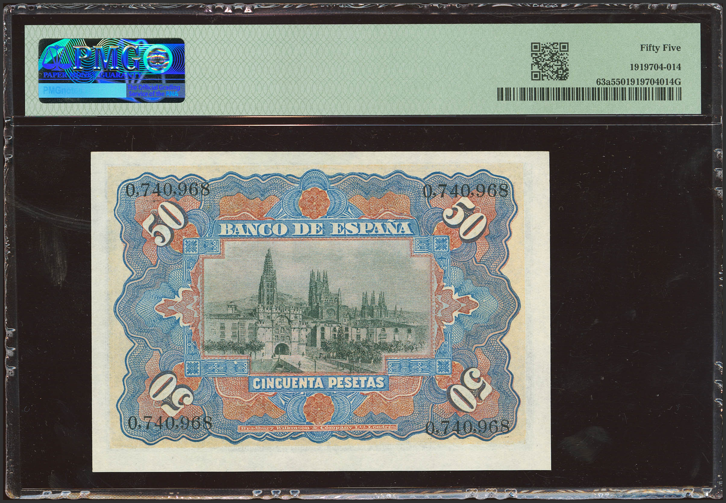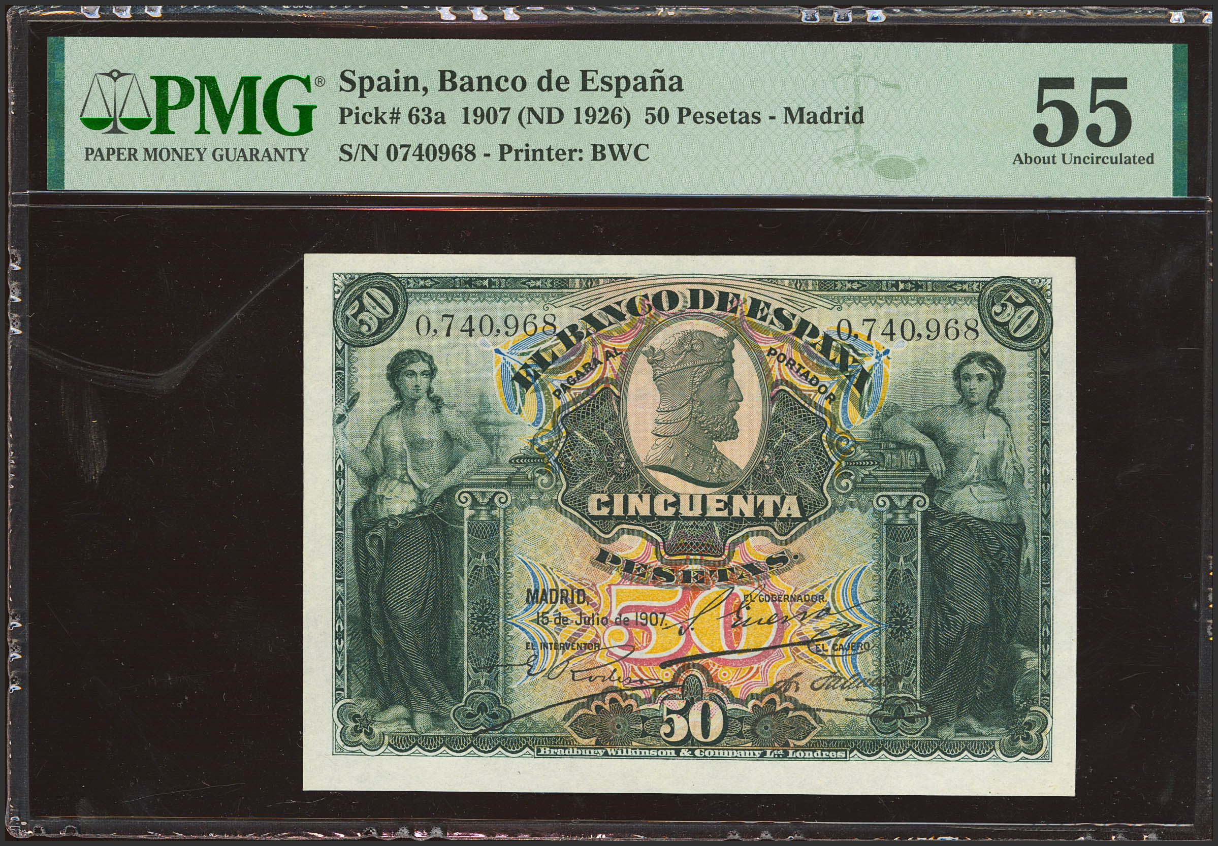 50 Pesetas. July 15, 1907. No series. (Edifil 2023: 319, Pick: 63a). Rare in this quality. Good Extremely Fine. Encapsulated PMG55.