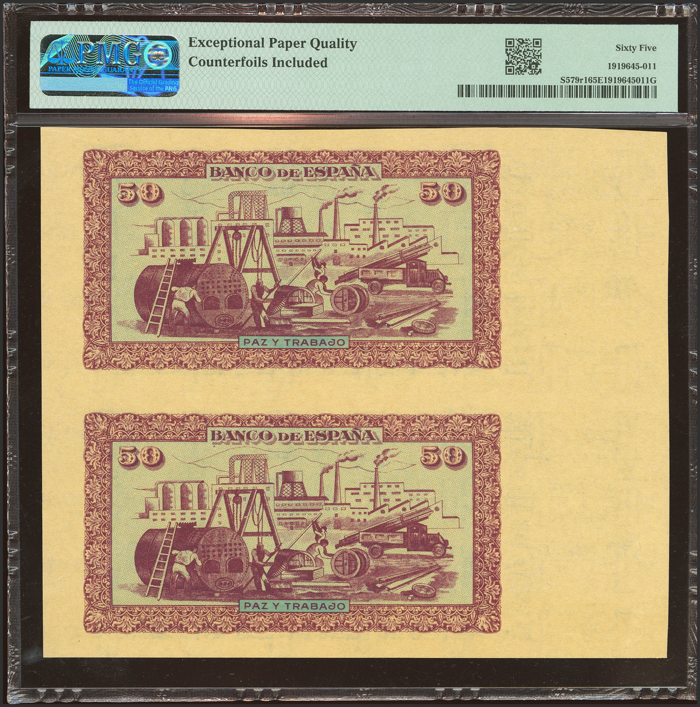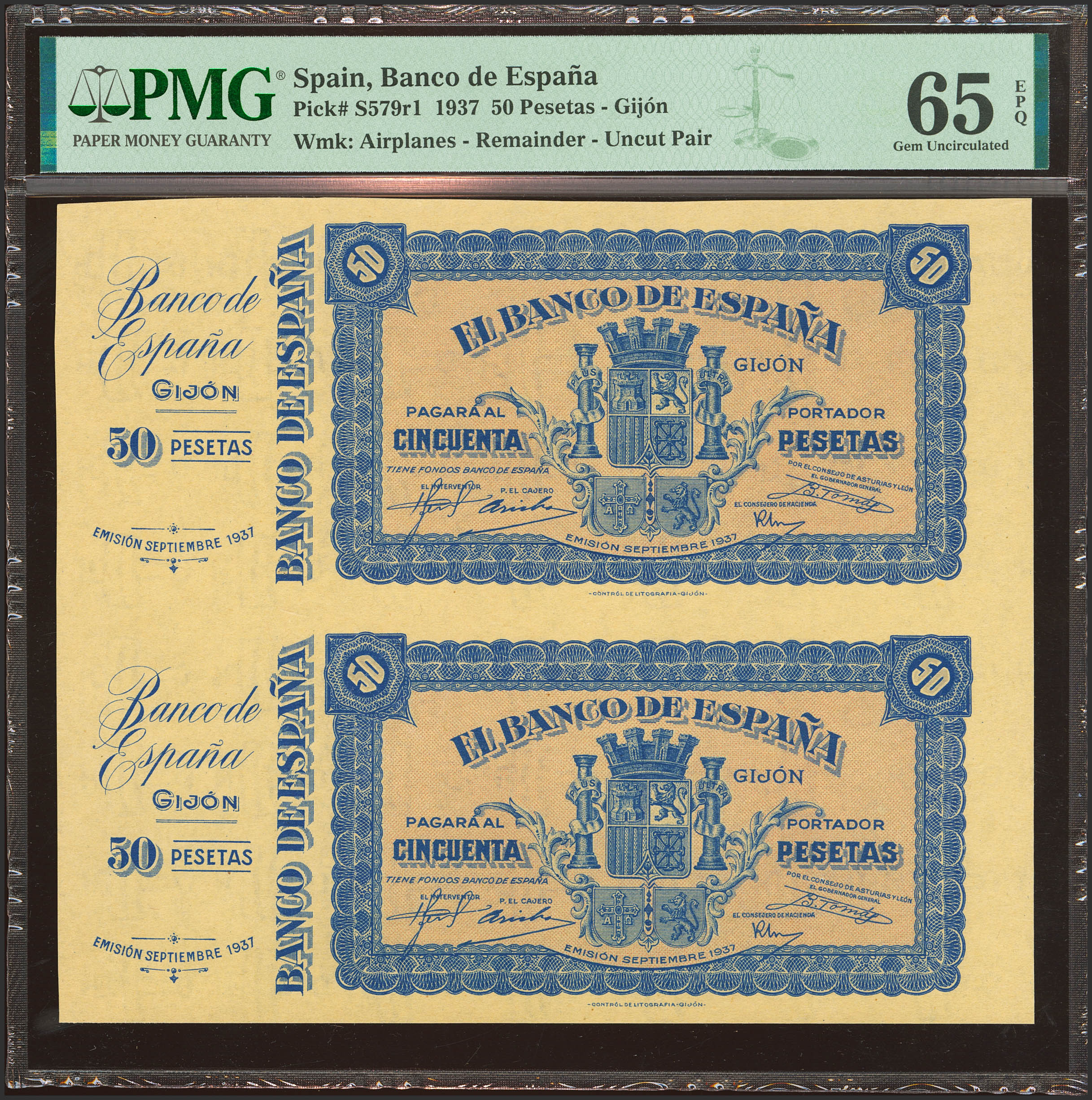 50 Pesetas. September 1937. Gijón branch. UNISSUED. Unguillotined pair. Unserialized and with the die on the left. (Edifil 2023: NE33b, Pick: S579r1). Extremely rare, especially in this exceptional quality, original sizing. Original. Uncut. Encapsulated PMG65EPQ. (To give an idea of the rarity, as of November 1, 2024, this is the only note certified by PMG in a pair.)