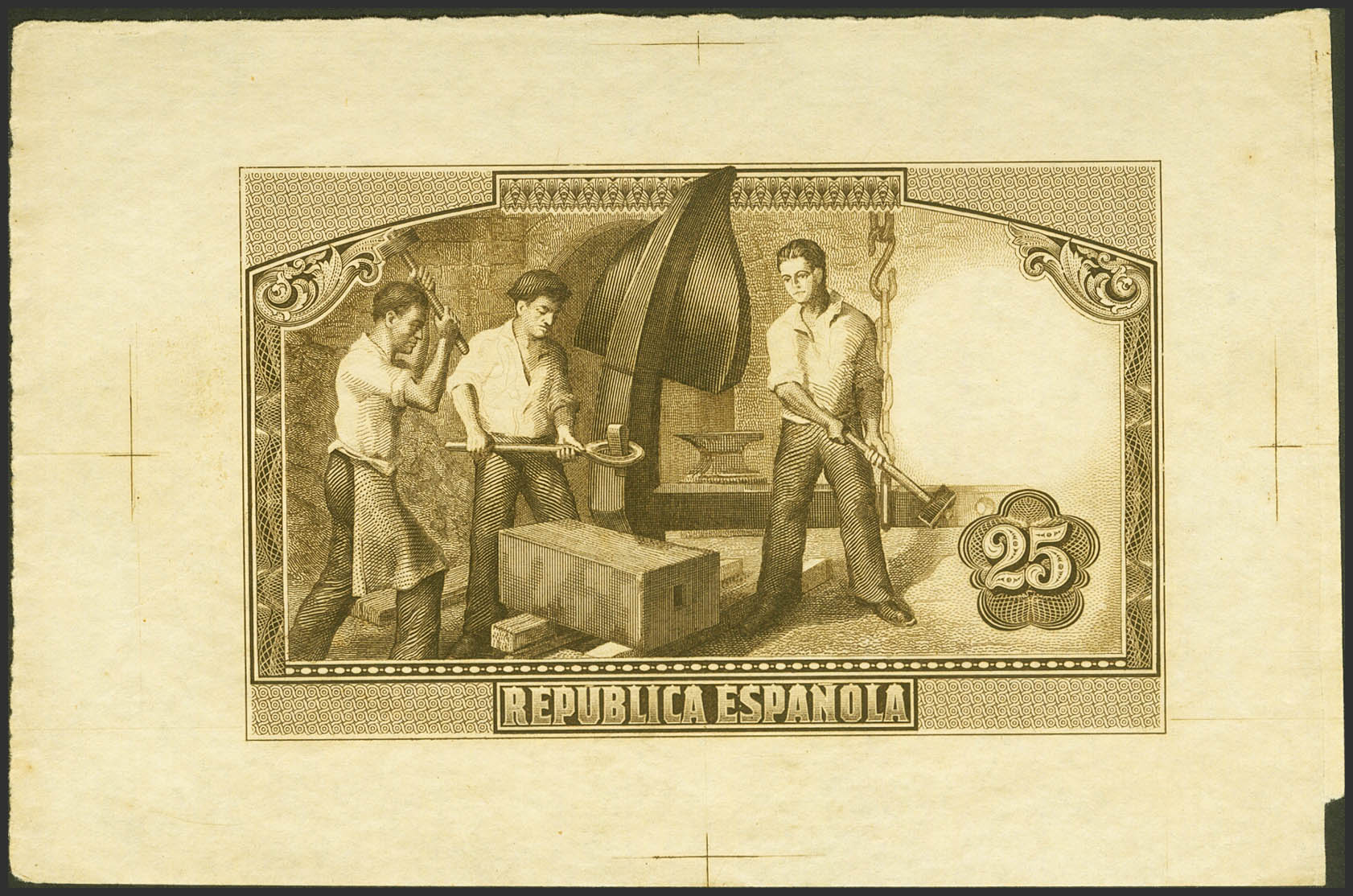 Reverse proof with large margins of the 25 Pesetas of 1938. Unissued. (Edifil 2023: NE28AP). Rare. Unused.